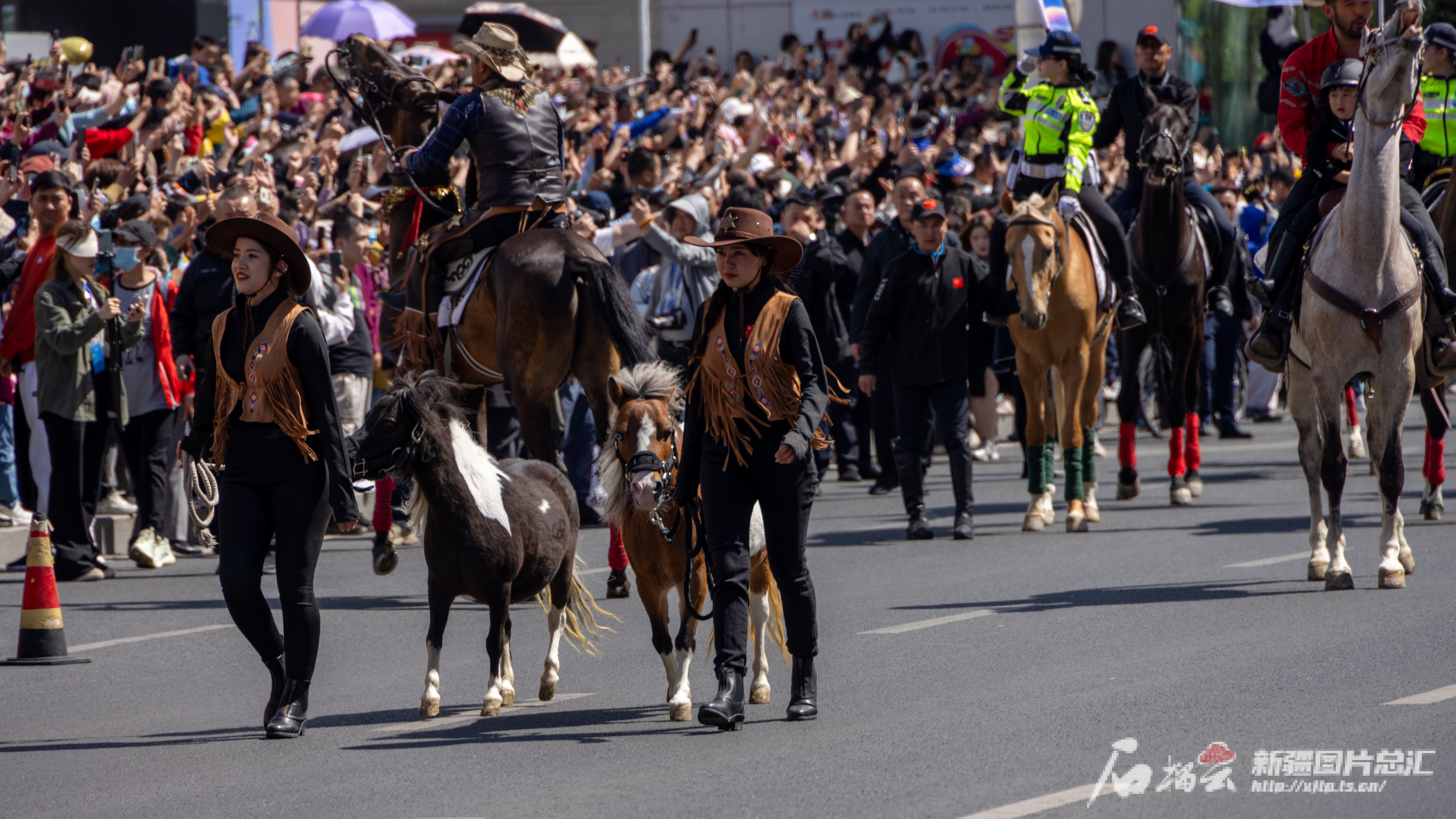 4月30日,在乌鲁木齐“丝路悦购·马上快乐”巡游活动上,群众纷纷驻足观看汗血宝马“炫”街。野马集团有限公司供图