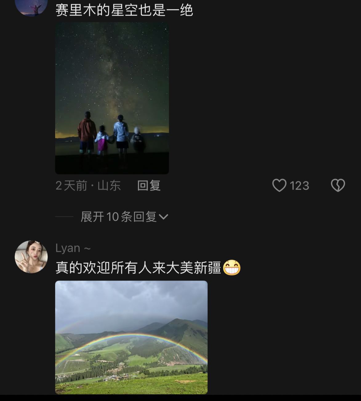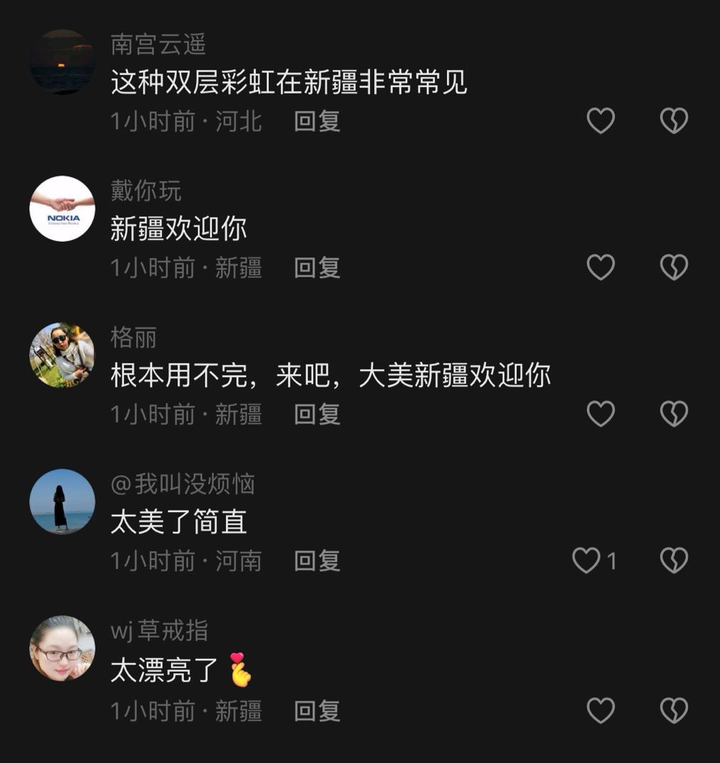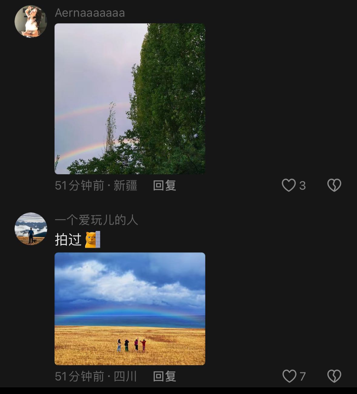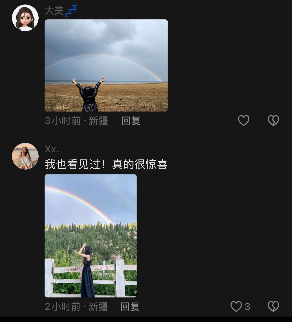 小姜在彩虹和草原上肆意奔跑,放声呐喊,引得广大网友羡慕不已。从不服输的网友也开始晒出自己在新疆拍到的彩虹美景和星空。