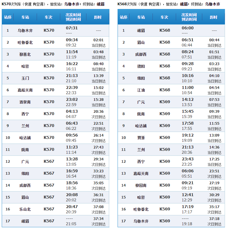 乌鲁木齐—峨眉K570/67、K568/69次快速旅客列车:全程往返均为17个停靠站点(如下图)。其中,K570/67次于6月14日起开行,7:31乌鲁木齐开,次日21:05峨眉到,全程37小时34分钟;K568/69次于6月16日起开行,6:00峨眉开,次日19:18乌鲁木齐到,全程37小时18分钟。