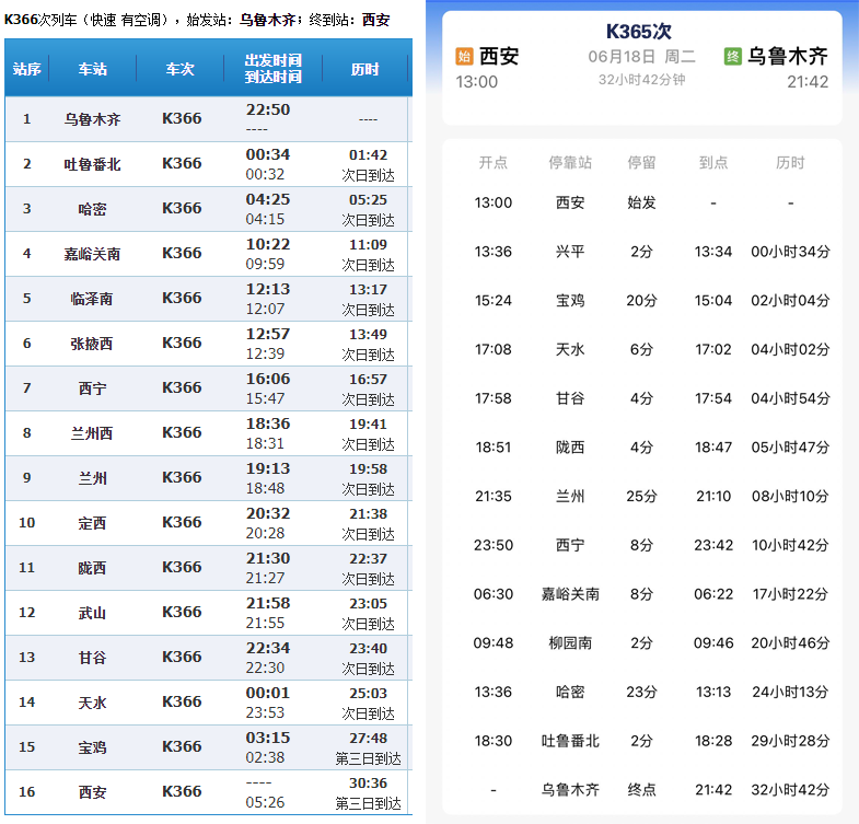 乌鲁木齐—西安K366/5次快速列车:K366次快速旅客列车于6月16日起开行,22:50乌鲁木齐开,第三日5:26西安到,全程共16个停靠站点、30小时36分钟;K365次快速旅客列车于6月18日起开行,13:00西安开,次日21:42乌鲁木齐到,全程共13个停靠站点、32小时42分钟。