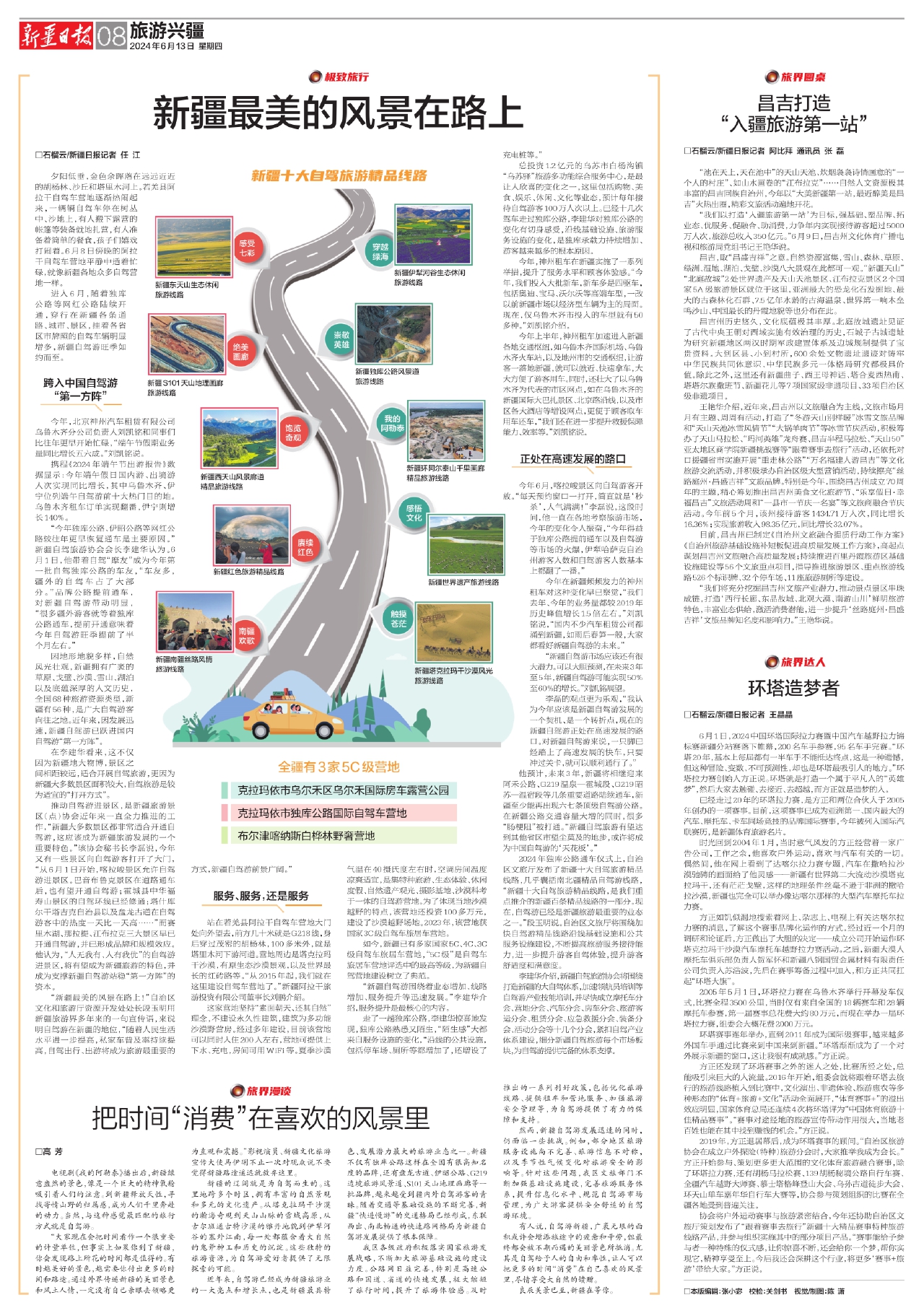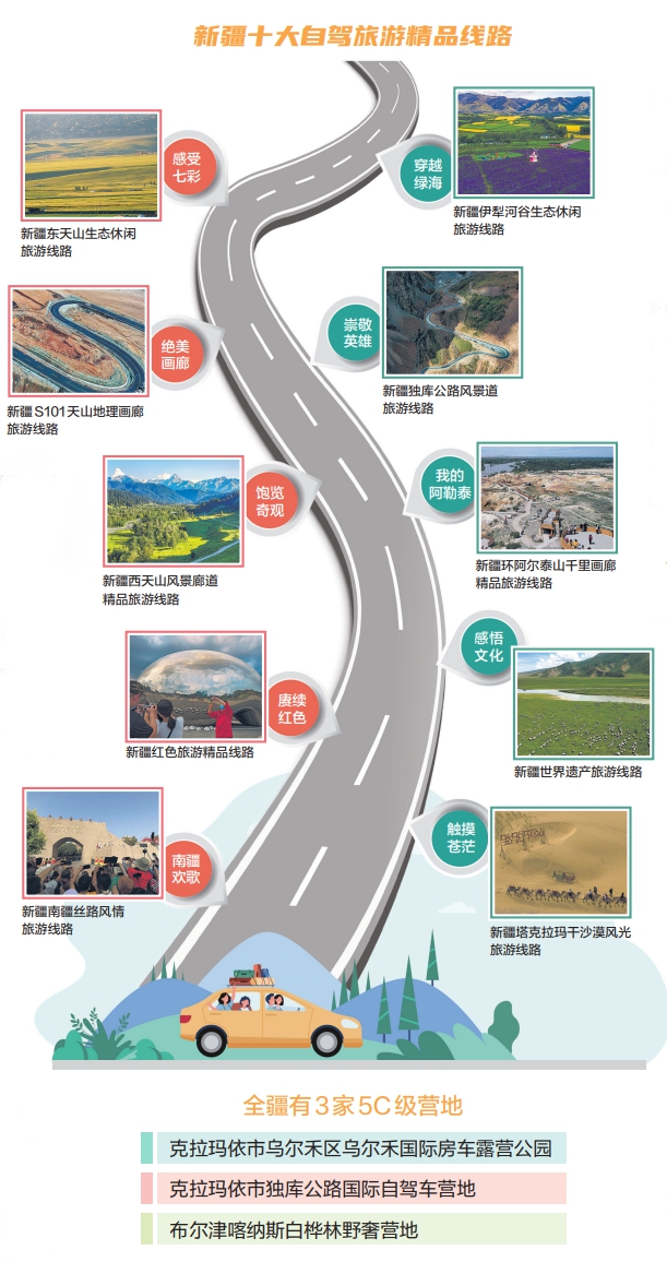 2024年独库公路通车仪式上,自治区文旅厅发布了新疆十大自驾旅游精品线路,几乎囊括南北疆精品自驾游线路,“新疆十大自驾旅游精品线路,是我们重点推介的新疆百条精品线路的一部分。现在,自驾游已经是新疆旅游最重要的业态之一。”段玉明说。自治区文旅厅将围绕加快自驾游精品线路沿线基础设施和公共服务设施建设,不断提高旅游服务接待能力,进一步提升游客自驾体验,提升游客舒适度和满意度。