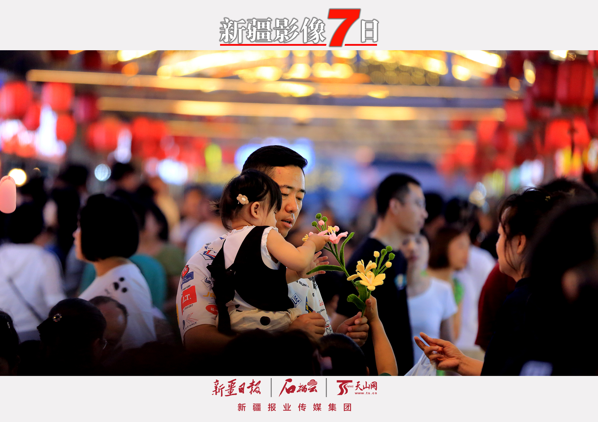 6月18日,一位家长抱着孩子在位于哈密市伊州区迎宾大道旁的天街夜市美食街游玩。 哈密市位于新疆东部,是新疆的“东大门”,也是新疆最早天黑的城市。入夜,华灯初上,哈密市大大小小的夜市烟火升腾,欢声笑语让人醉在不眠中。 石榴云/新疆日报记者 蔡增乐摄