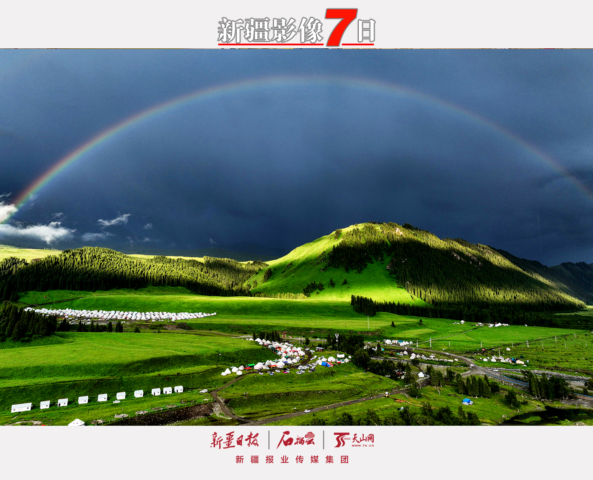 6月18日清晨,小雨过后,一道彩虹高悬于尼勒克县唐布拉草原上空,美轮美奂。 张庆华摄
