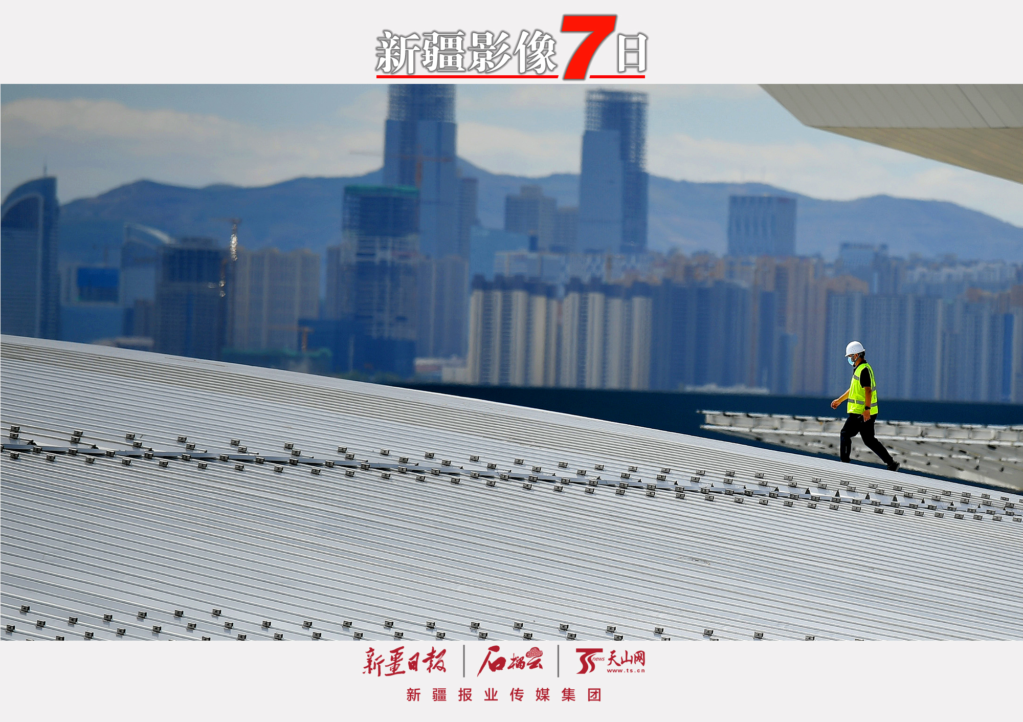 6月18日,工程技术人员在乌鲁木齐机场改扩建工程交通中心顶部巡查。古尔邦节假期,乌鲁木齐机场改扩建工程工作人员坚守岗位,加紧施工。目前,该工程航站楼项目已进入装修收尾和设备联调联试阶段,预计明年投入运营。 石榴云/新疆日报记者 邹懿摄