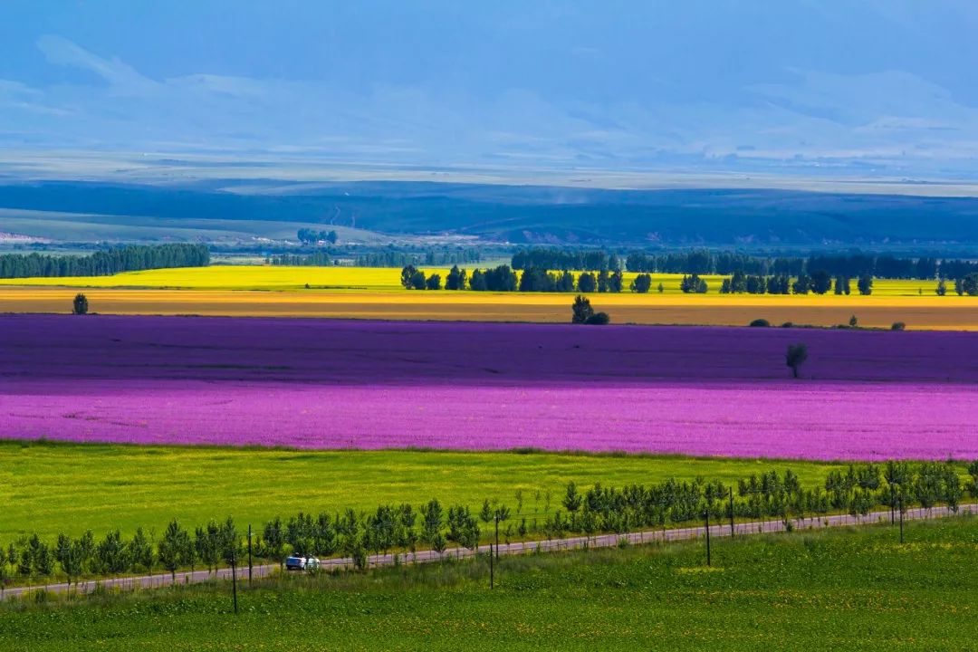 盛夏七月,昭苏草原的景色同样“封神”。广袤的绿色背景上,大片大片黄灿灿的油菜花、向日葵花镶嵌其中,仿佛天幕上绘就的一幅巨大的油画。