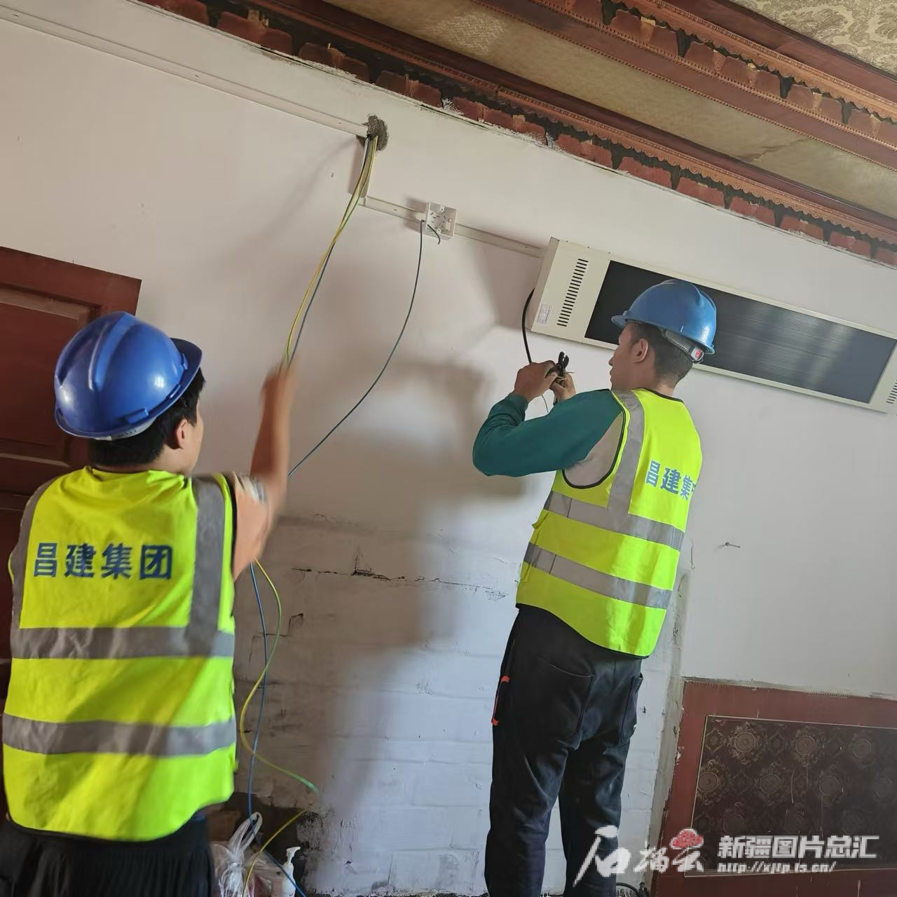2024年8月23日,工作人员在阿瓦提县卡拉塔宋村安装辐射板、线槽、温控器等。杨庆摄