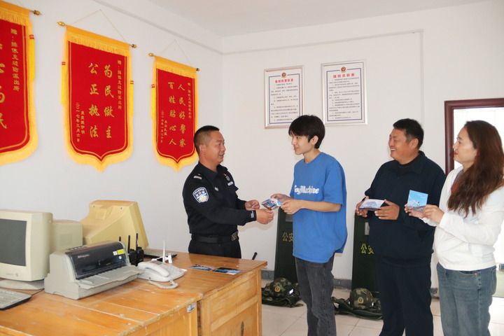 2024年8月,在排依克派出所红色教育基地,彭明有为一位17岁的天津高中生和他的父母讲解后,赠送派出所的明信片留念。受访者供图