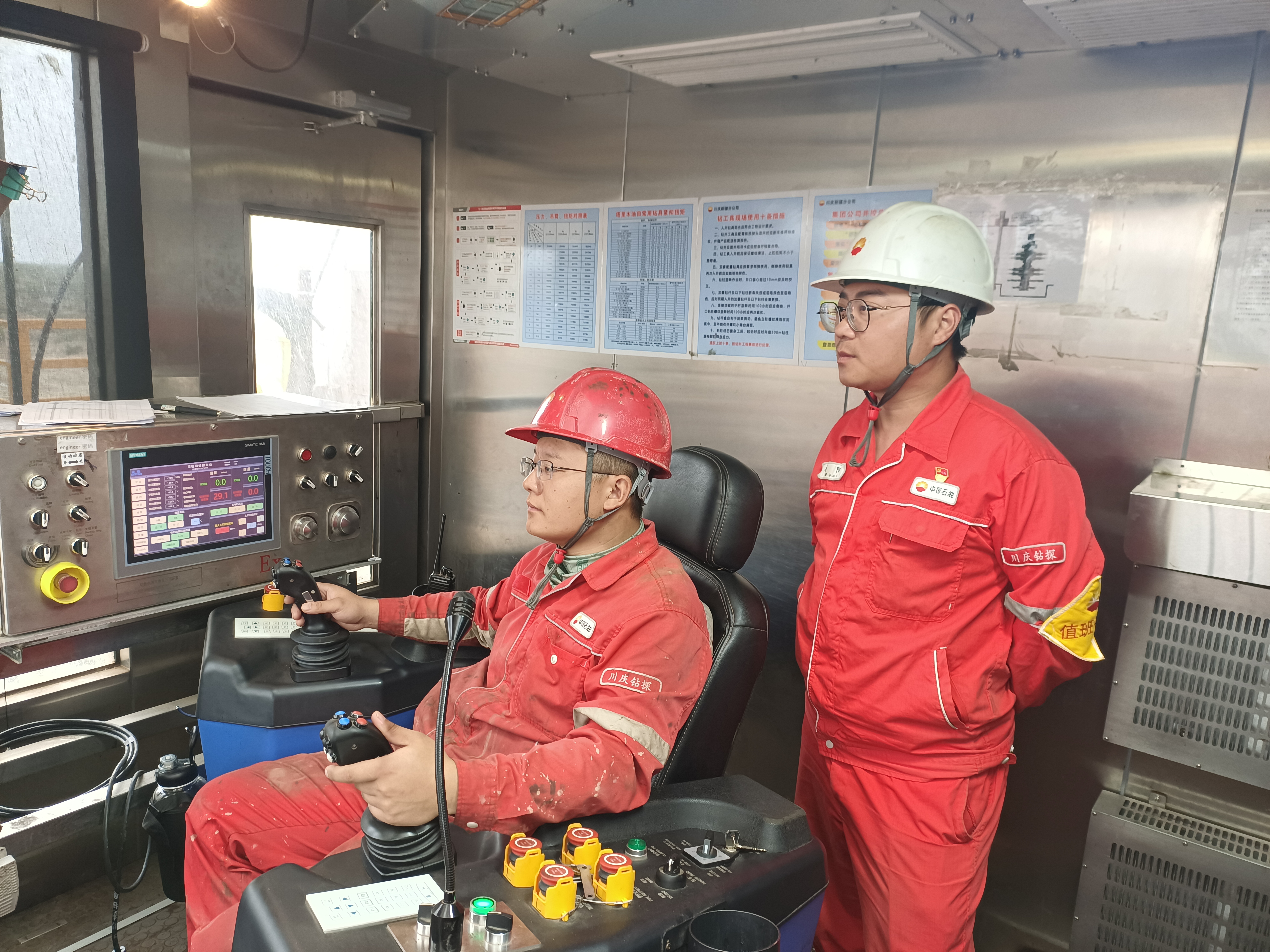 8月26日,在承钻哈602-H5井的钻井队司钻房内,石油人手握刹把,精准控制钻头起起落落。谭辉 摄