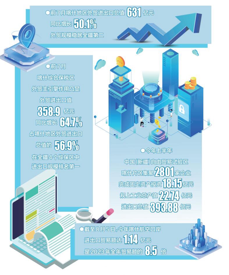 前7月,喀什地区外贸进出口总值631亿元、同比增长50.1%,外贸规模稳居全疆第二;喀什综合保税区外贸主引擎作用凸显,外贸进出口值358.9亿元、同比增长64.7%,占喀什地区外贸进出口总值的56.9%,在全疆4个综保区中,进出口规模排名第一……