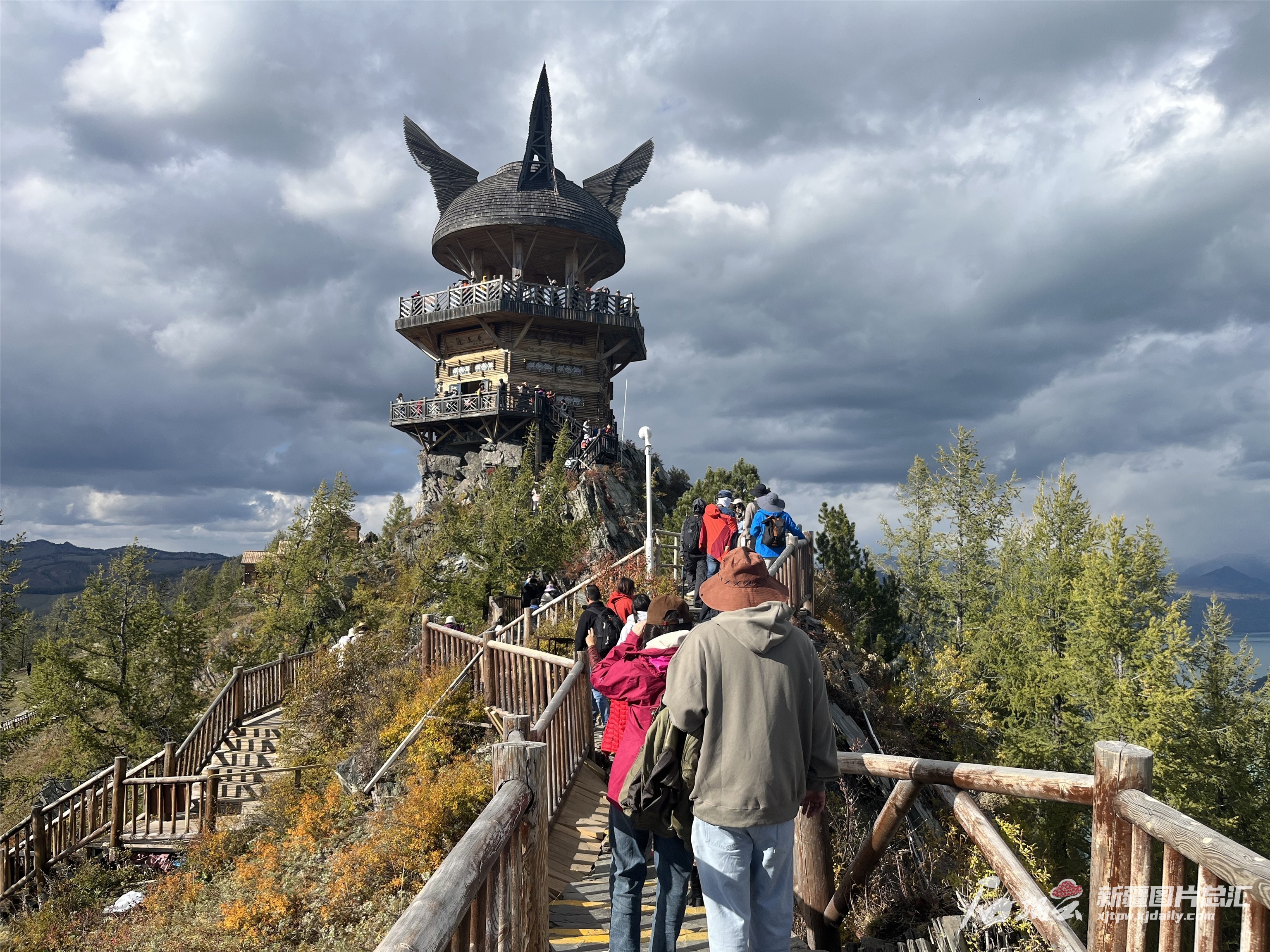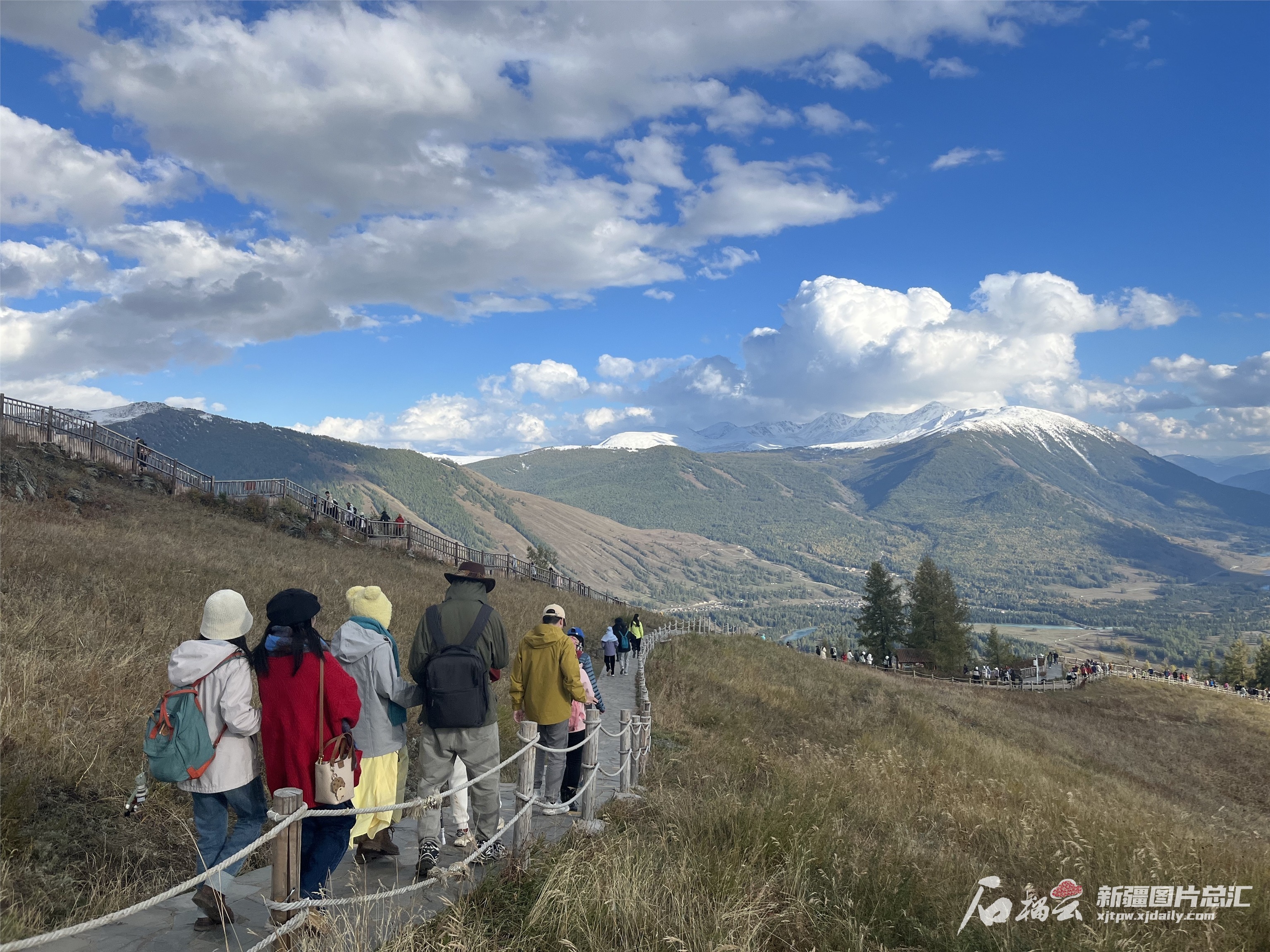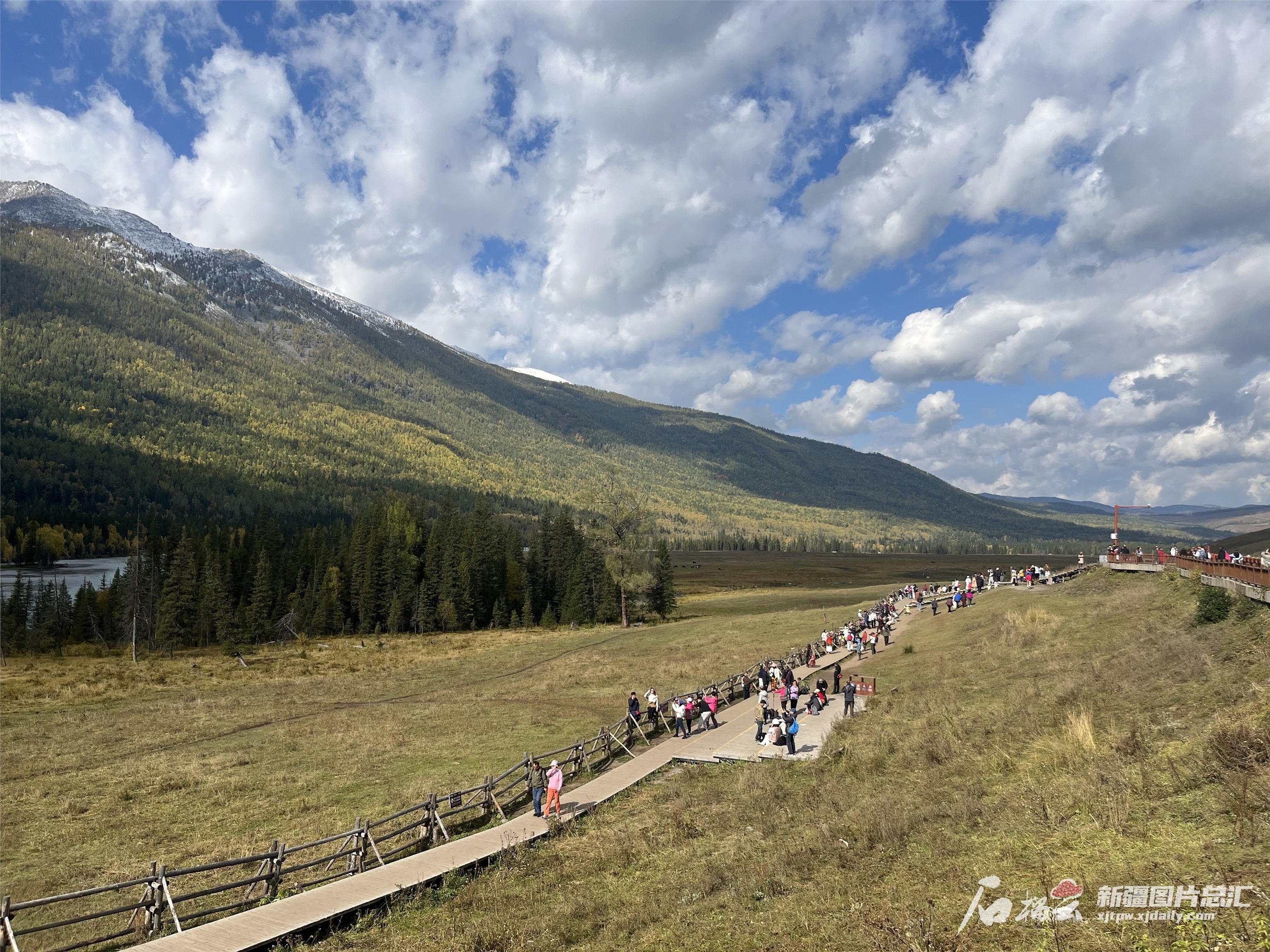 9月18日,游客在喀纳斯景区游玩。秋日的喀纳斯美不胜收,络绎不绝的游客前来欣赏如画般的秋景。孟照鹏 摄