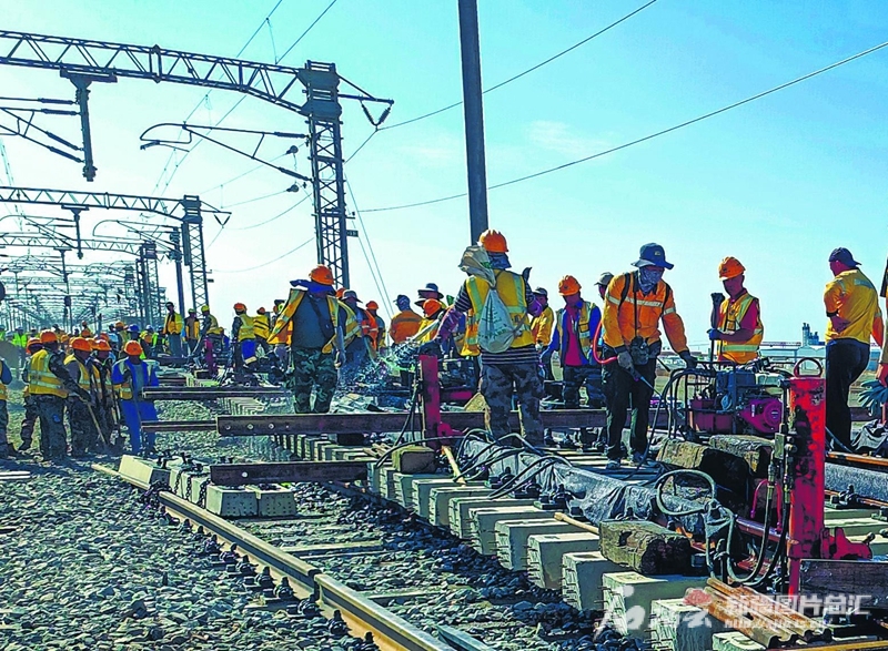 9月19日,工人在罗布泊至若羌铁路米兰至若羌段作业。该铁路东起哈罗铁路罗中站,在米兰镇接入格库铁路米兰站,沿格库铁路引入若羌站,新建线路全长近300公里。赵树明摄
