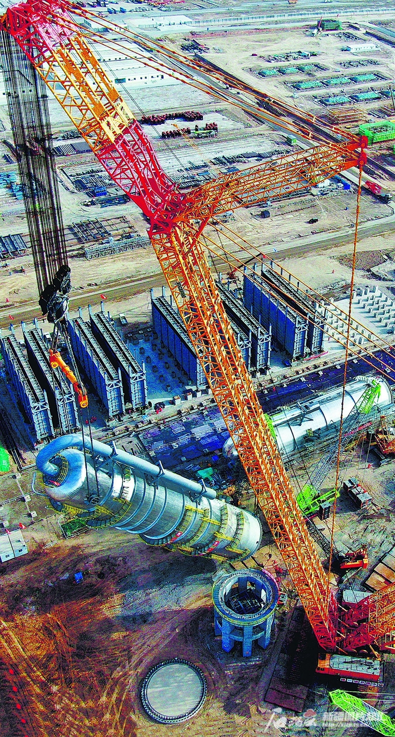 9月17日,位于库尔勒上库工业园区的中国石油独山子石化塔里木120万吨/年二期乙烯项目建设现场,我国自主研制的“大国重器”、有着“神州第一吊”美誉的4000吨级履带式起重机将乙烯装置急冷水塔缓缓吊起,标志着该项目正式进入设备安装阶段。于文亮摄
