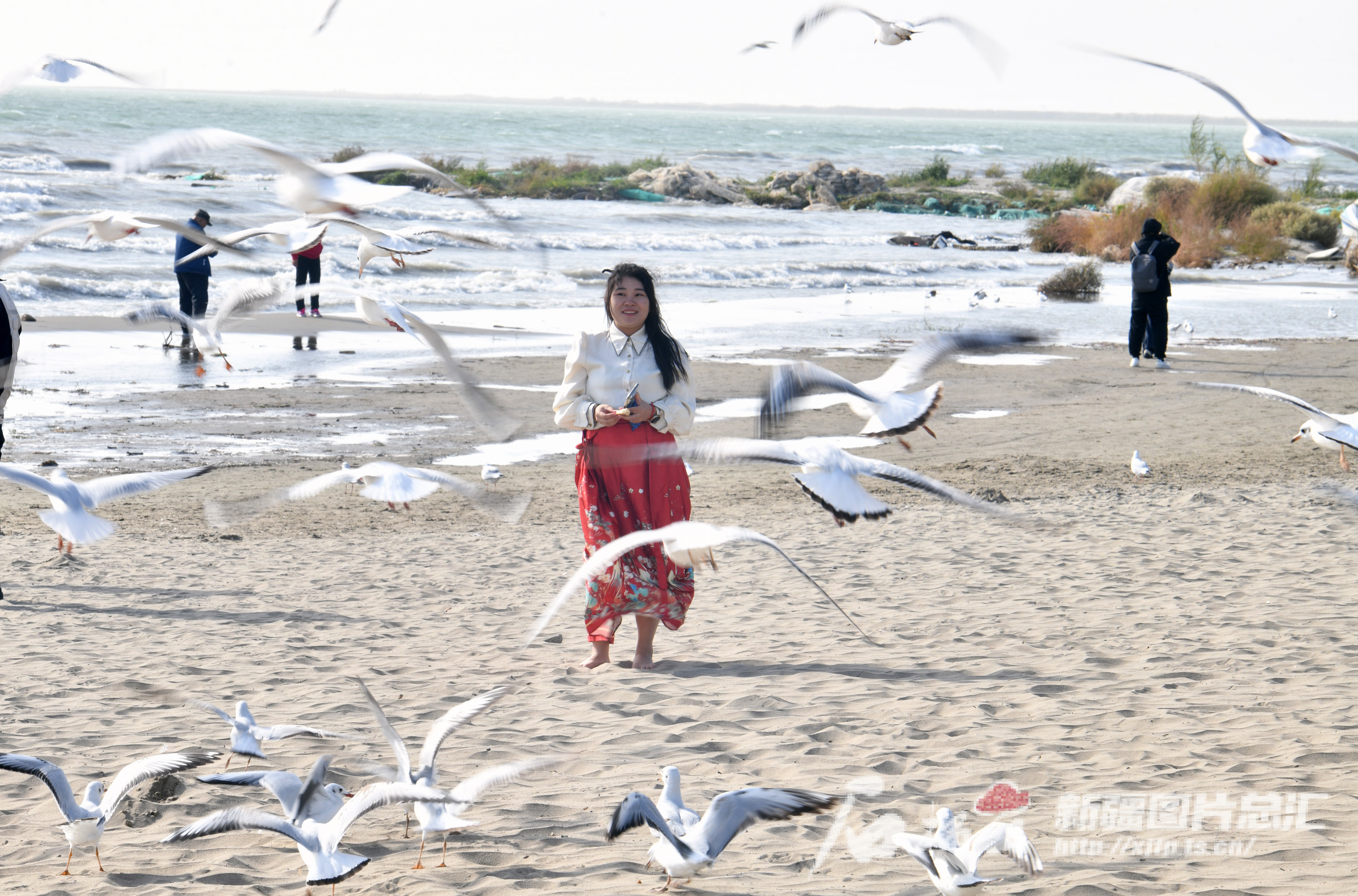 10月2日,在和硕县金沙滩旅游度假区,游客与海鸥和谐相处。天山网-新疆日报记者 张新军摄