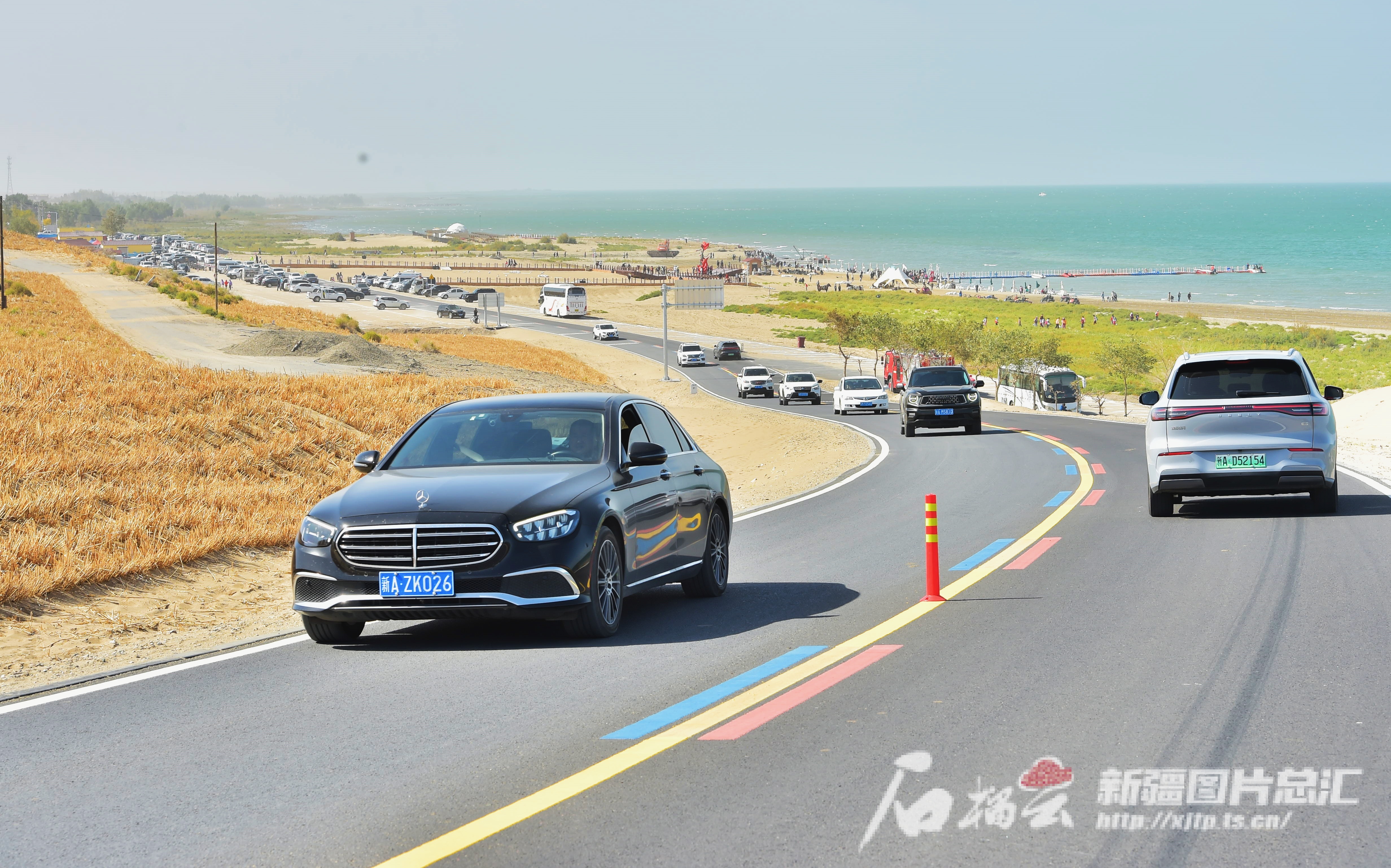 10月1日,自驾游车辆行驶在环博斯腾湖公路上。天山网-新疆日报记者 王立华摄