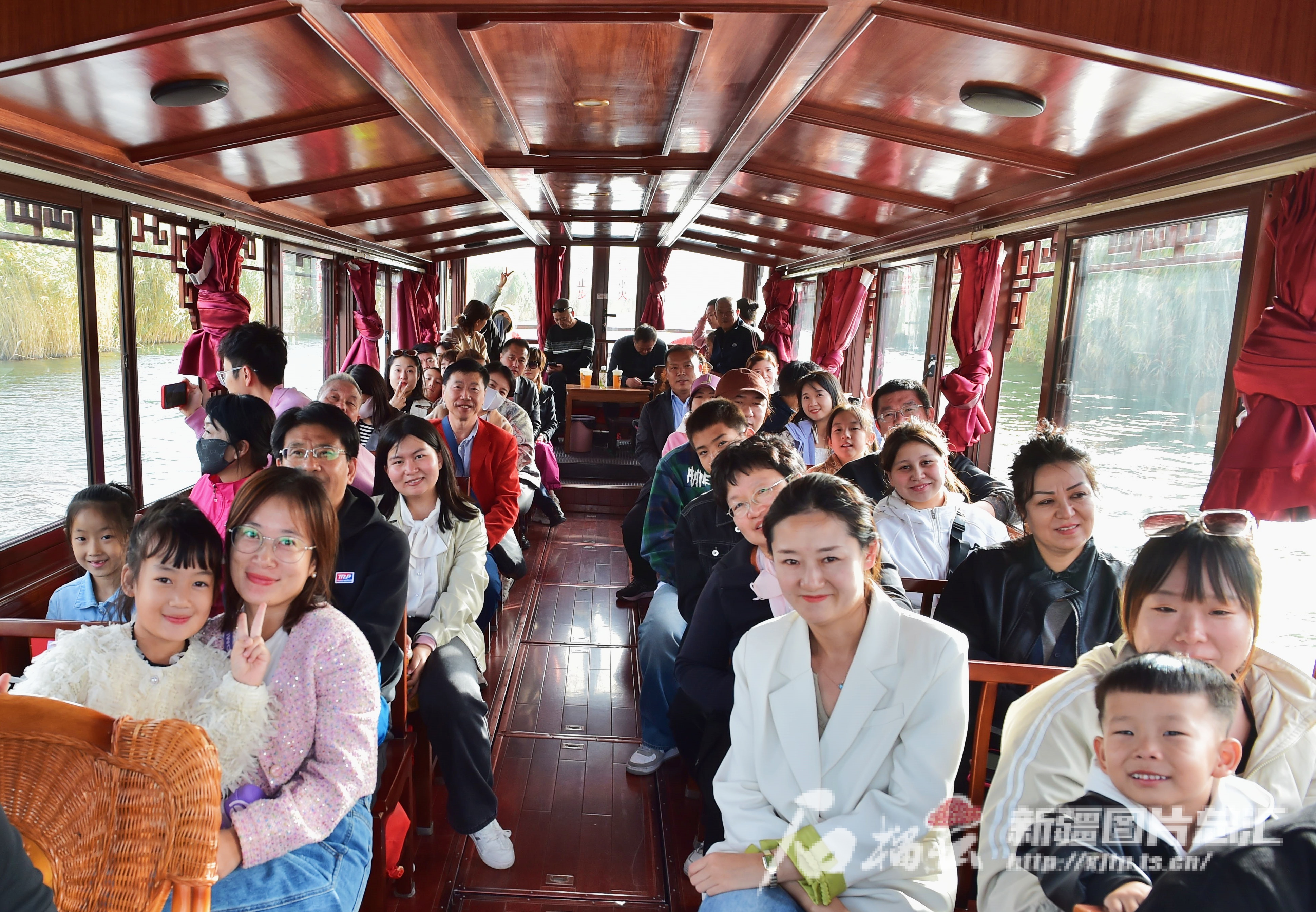 10月2日,游客在博斯腾湖莲海世界景区乘坐游船赏景游玩。天山网-新疆日报记者 王立华摄