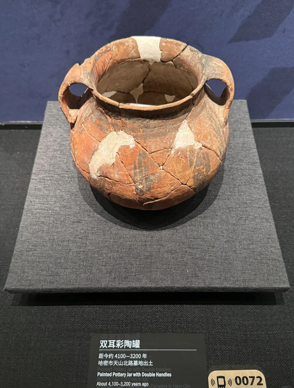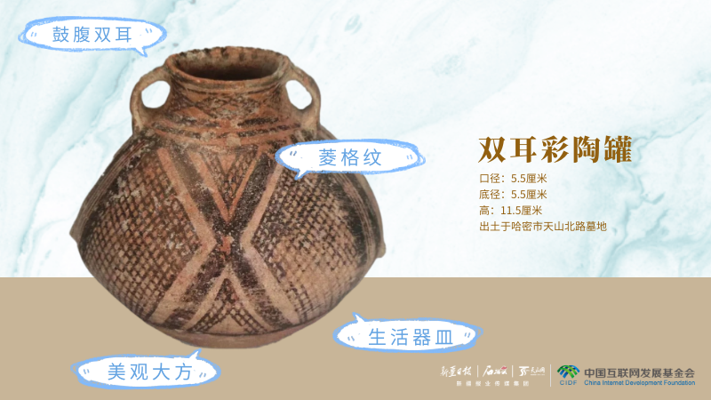 上面这款“两只耳朵”的文物是来自新疆哈密的双耳彩陶罐,距今约有近4000年的历史。