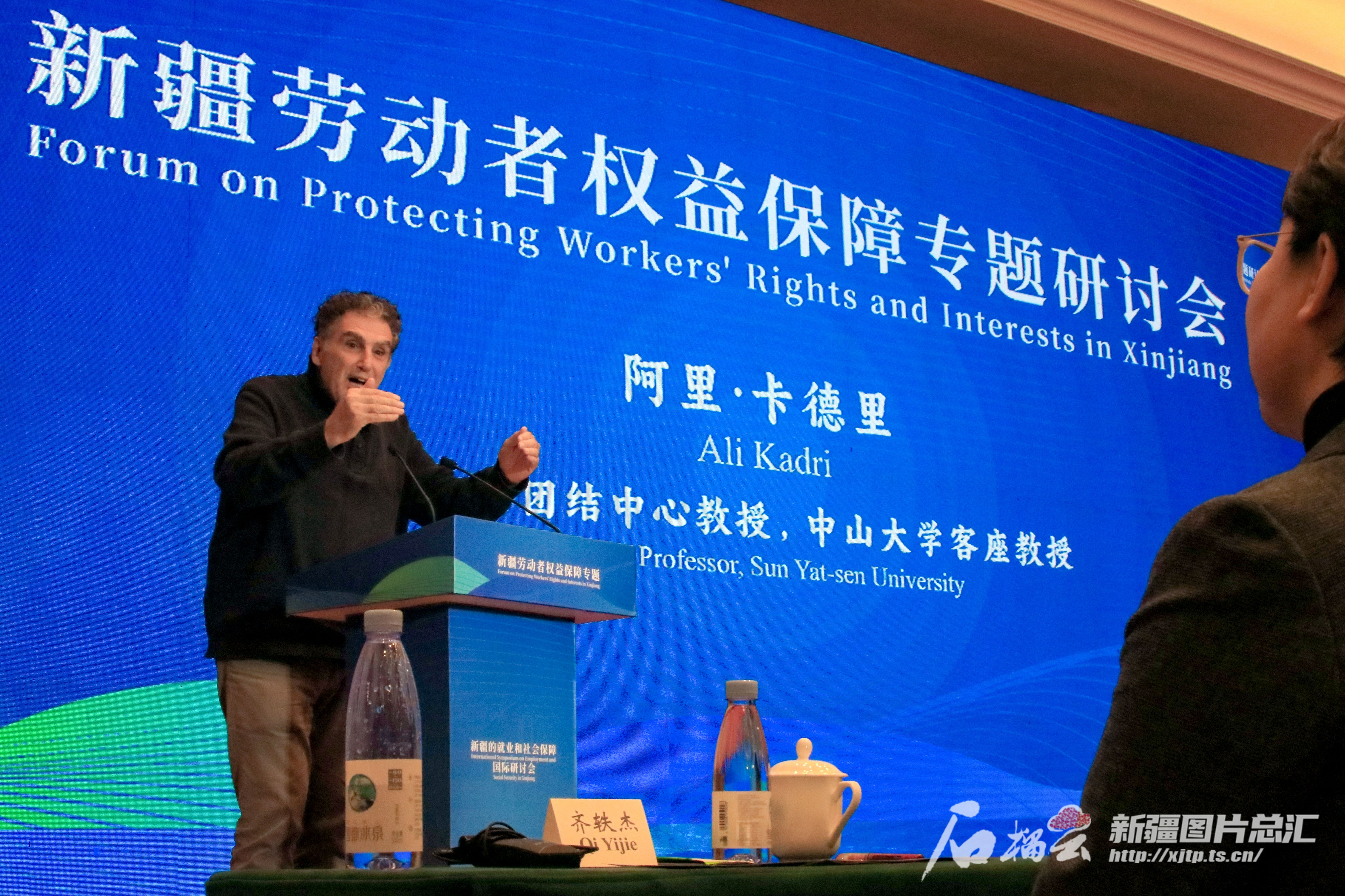 12月16日,阿拉伯团结中心教授、中山大学客座教授阿里·卡德里在新疆劳动者权益保障专题研讨会上发言。
