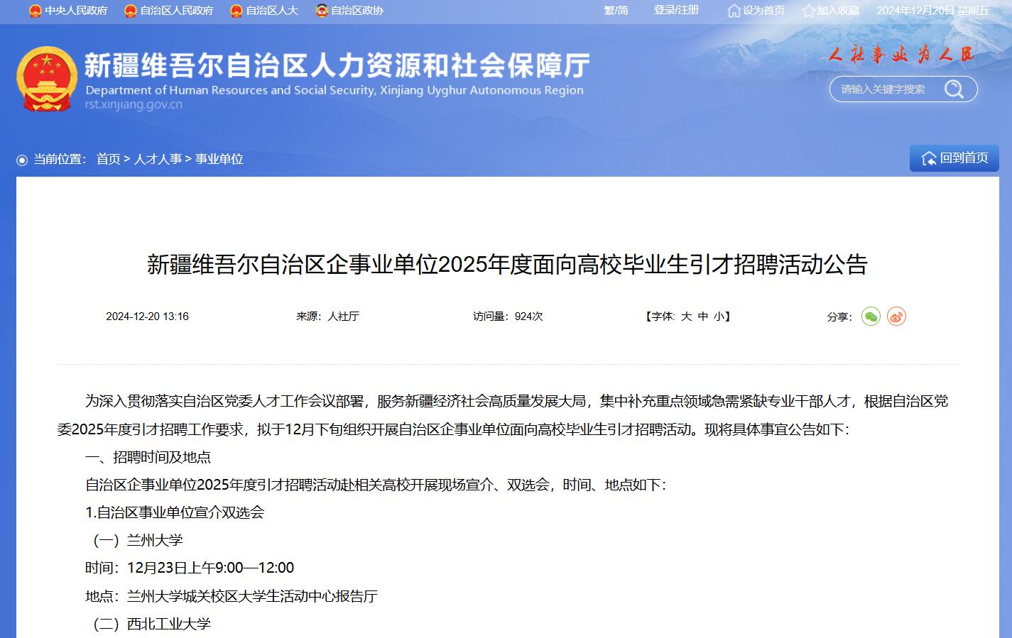 12月20日,自治区人力资源和社会保障厅网站发布《新疆维吾尔自治区企事业单位2025年度面向高校毕业生引才招聘活动公告》。