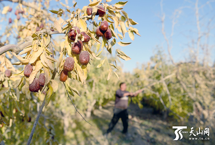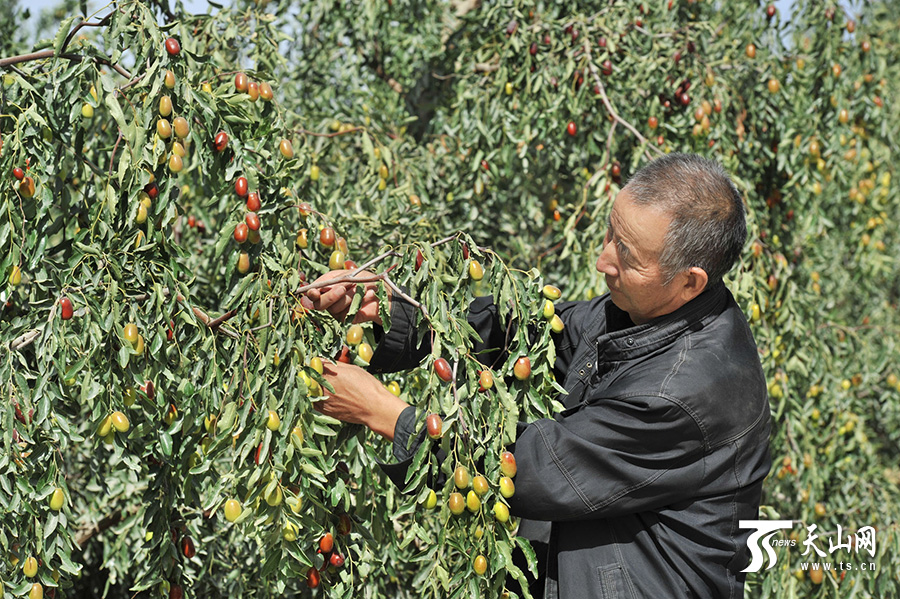 枣农查看红枣长势。(记者约提克尔·尼加提摄影)