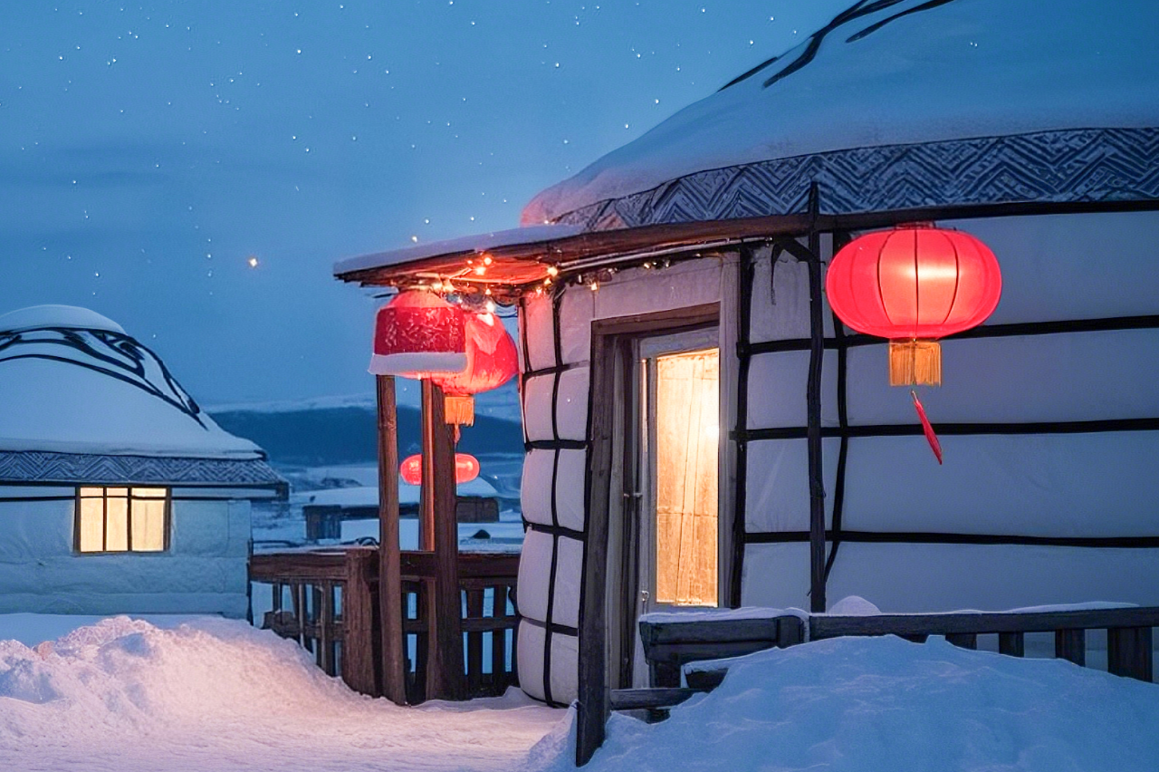来自广东的游客李女士在朋友圈写道:“在大河口蒙古包里吃火锅、缸子鱼,窗外是雪原湖景,这种混搭的年味太独特了!”