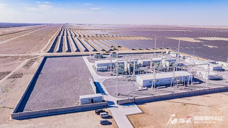 中国绿发新疆中绿电若羌400万千瓦光伏项目断路器顺利合闸,标志着我国单体容量最大“沙戈荒”光伏项目并网成功。施新蕾摄