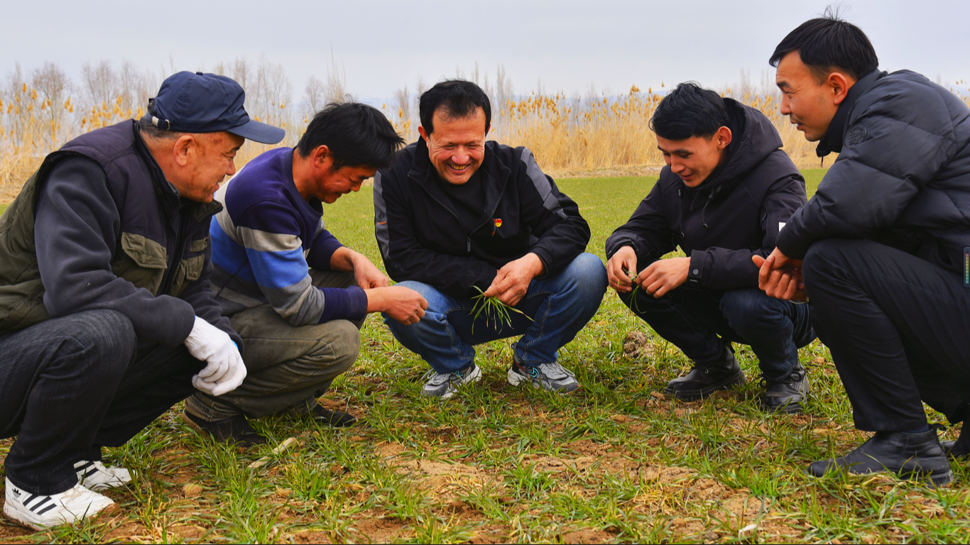全国人大代表、新源县肖尔布拉克镇克热格塔斯村村民木沙江·海拉特(中)在田间地头收集基层群众意见建议。本人供图