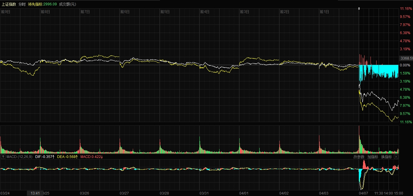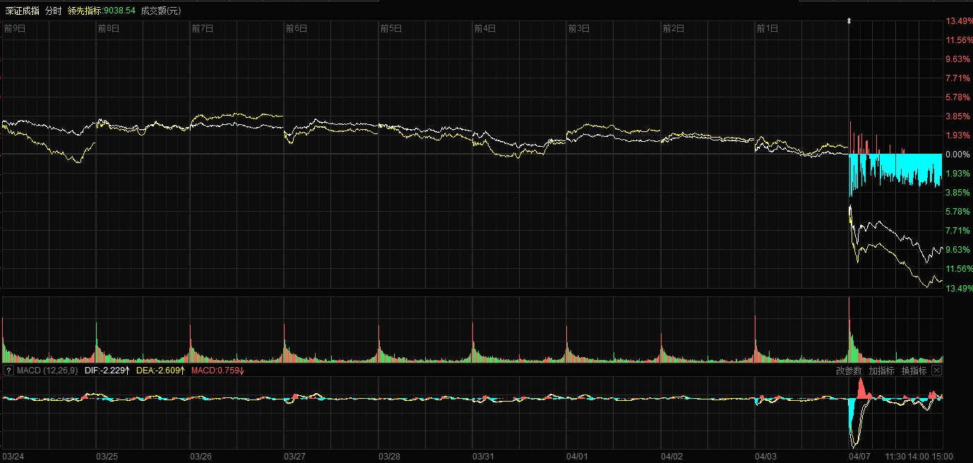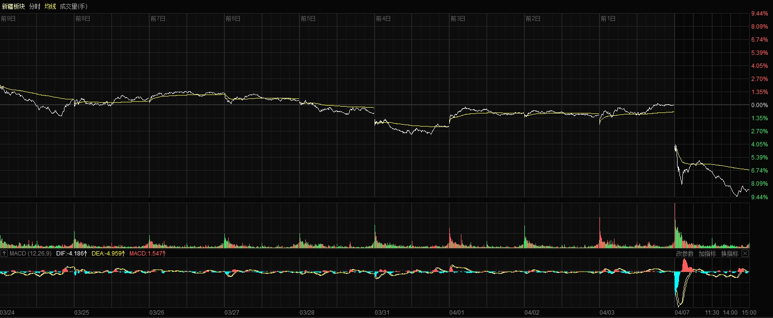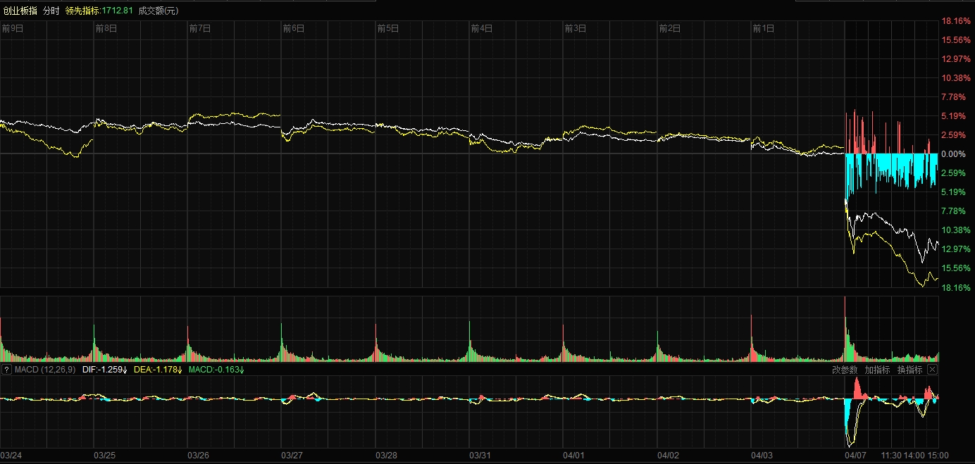 天山网-新疆日报讯(记者康颢严报道)4月7日,A股三大指数集体收跌。截至收盘,上证指数跌7.34%,报收3096.58点;深证成指跌9.66%,报收9364.50点;创业板指跌12.50%,报收1807.21点。沪深两市成交额约15877.99亿元,较前一个交易日放量约4501.79亿元。