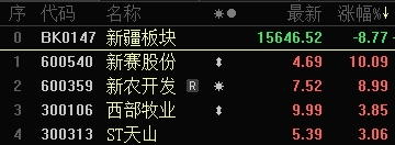 今日,受农林牧渔板块逆势大涨带动,新赛股份涨幅居新疆板块之首,上涨10.09%,报收4.69元;新农开发上涨8.99%,报收7.52元;西部牧业上涨3.85%,报收9.99元;ST天山上涨3.06%,报收5.39元。科力股份、熙菱信息、立昂技术、元道通信、川宁生物跌幅居前。