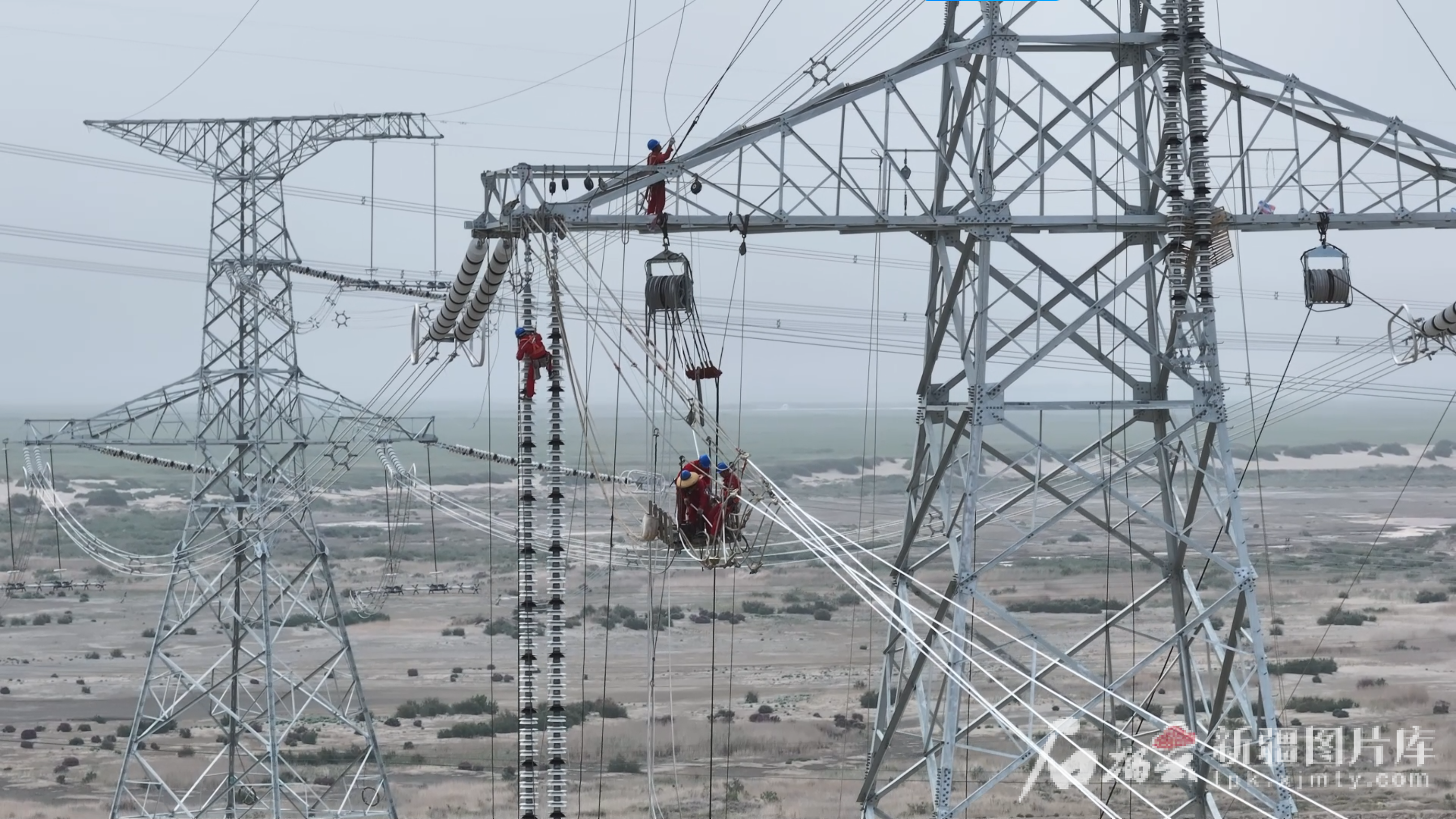 巴州—铁干里克—若羌750千伏超高压输变电工程现场,电力工人正在铁塔上牵引导线进行连接(资料图片)。申凯龙 摄