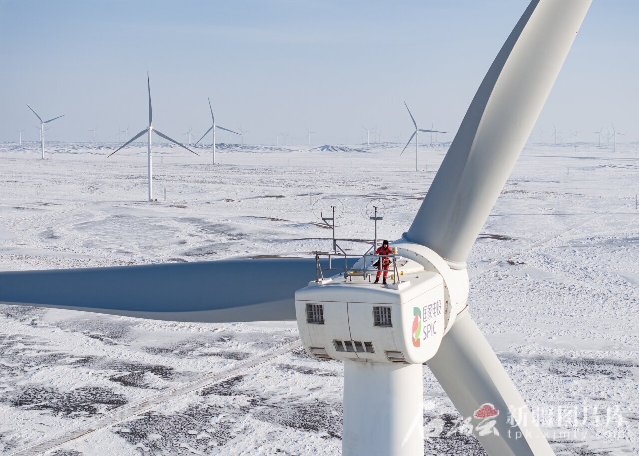 技术人员在木垒老君庙风电场检修风机(资料图片)。何龙 摄