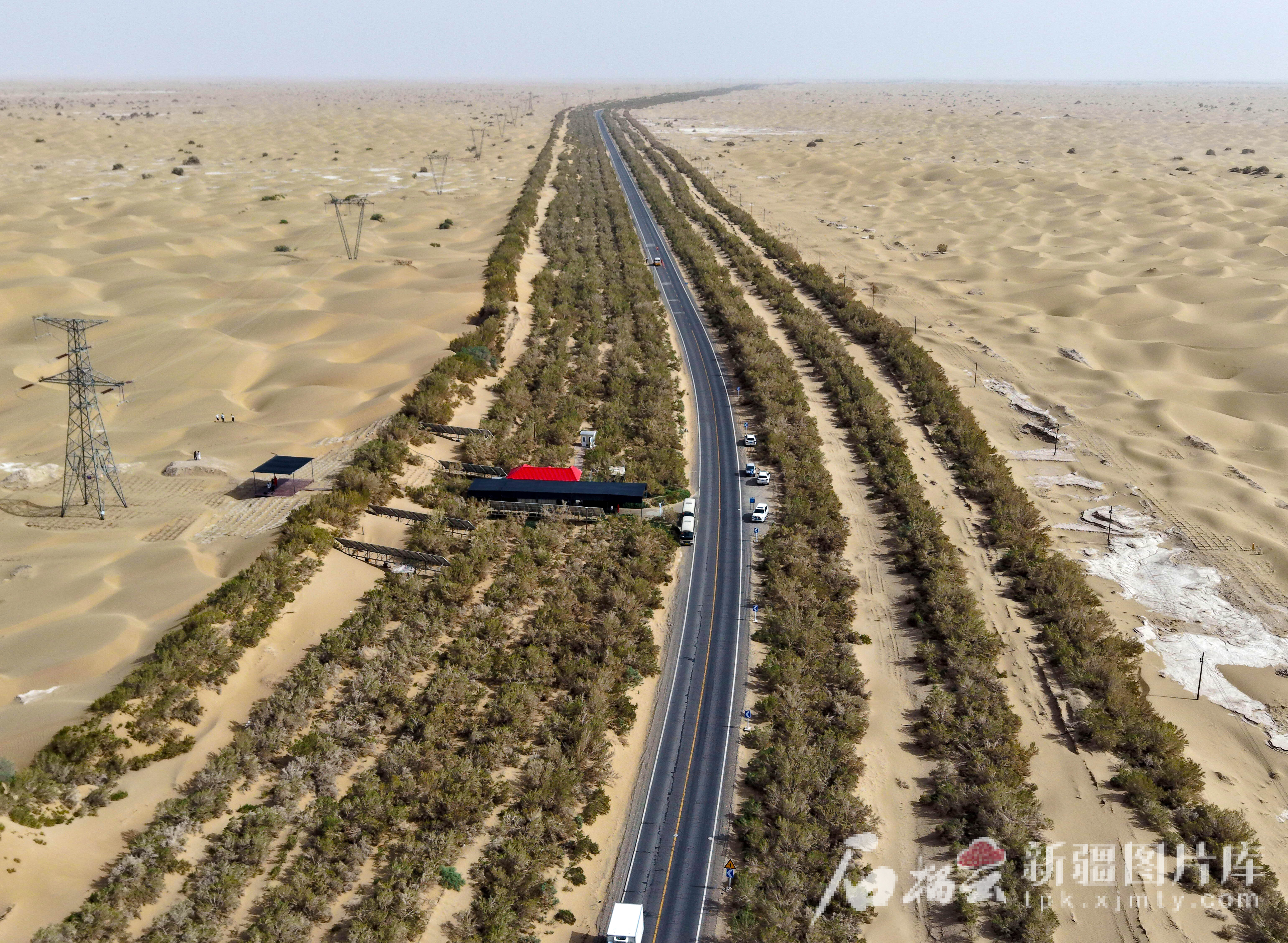 至此,一条长436公里,宽约75米的“人工绿色长廊”扎根沙海。沿防护林带布设的109座水井房日夜抽水浇灌,让2080万株柽柳、沙拐枣、梭梭等抗旱耐盐碱沙生植物在沙漠公路两旁傲然挺立。