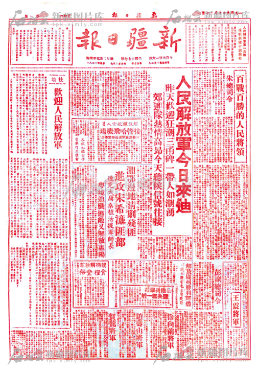 走进新疆日报报史馆,在“红色基因一脉相承”展区,一张套红印刷的全版《新疆日报》,永久记录着1949年10月20日人民解放军进驻迪化(今乌鲁木齐)那“换了人间”的历史一幕。这抹红色穿越76年时光,仍传递着各族人民欢迎雄师入城时的喜悦与豪情。《人民解放军今日来迪》的报道如此记述:“当人民解放军由吐鲁番启程西来的消息传出后,瞬息之间,整个迪化市便掀起一股欢欣鼓舞的热浪,大街小巷的每家门口,都悬挂着庄严的五星国旗,远望市区,变成了红旗的大海洋。在每个十字街头的雄伟彩楼下,人群熙攘,川流不息,围成了人山人海。”