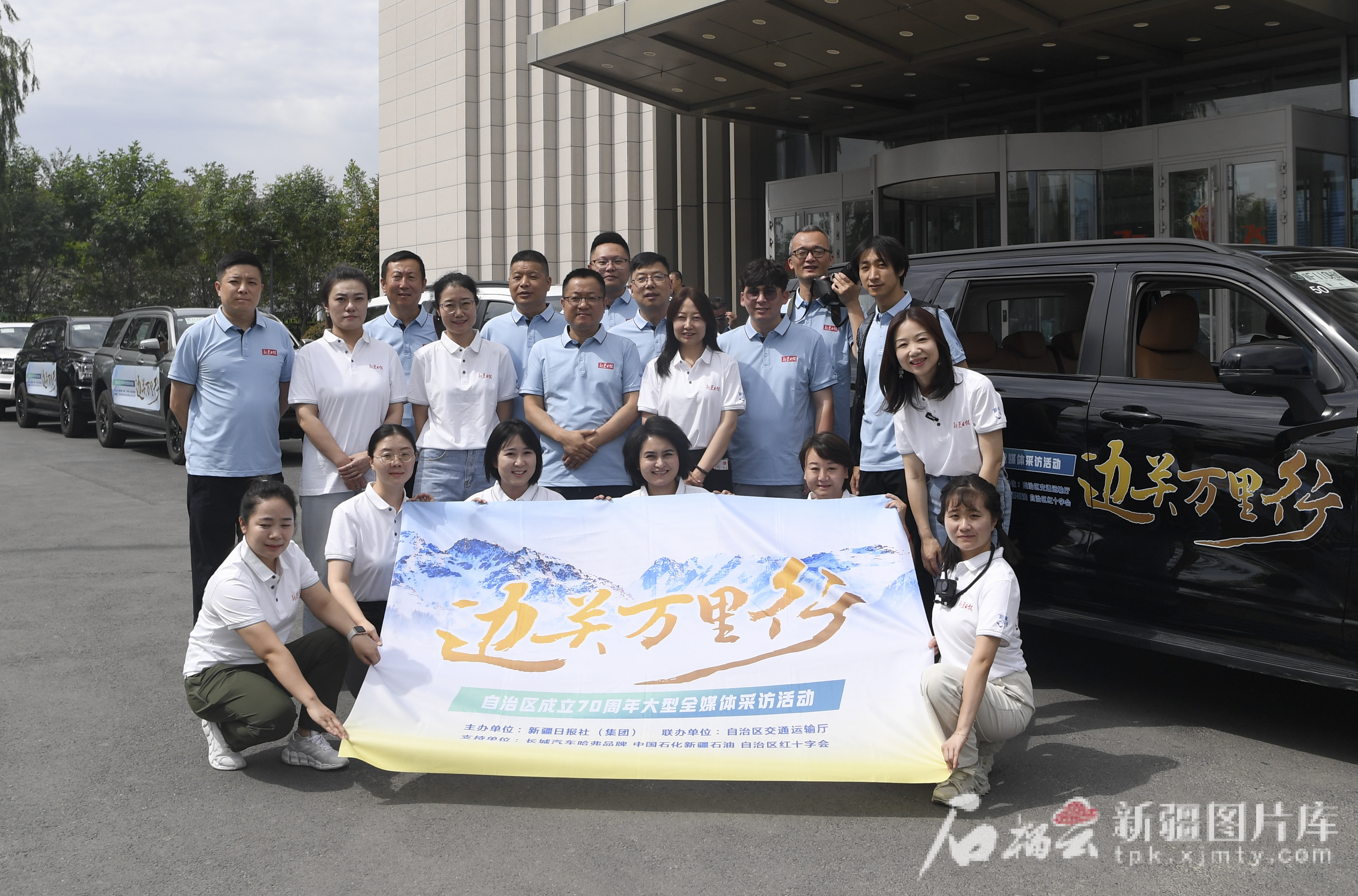 6月17日,参加“边关万里行”自治区成立70周年大型全媒体采访活动的记者合影。天山网-新疆日报记者 韩亮摄