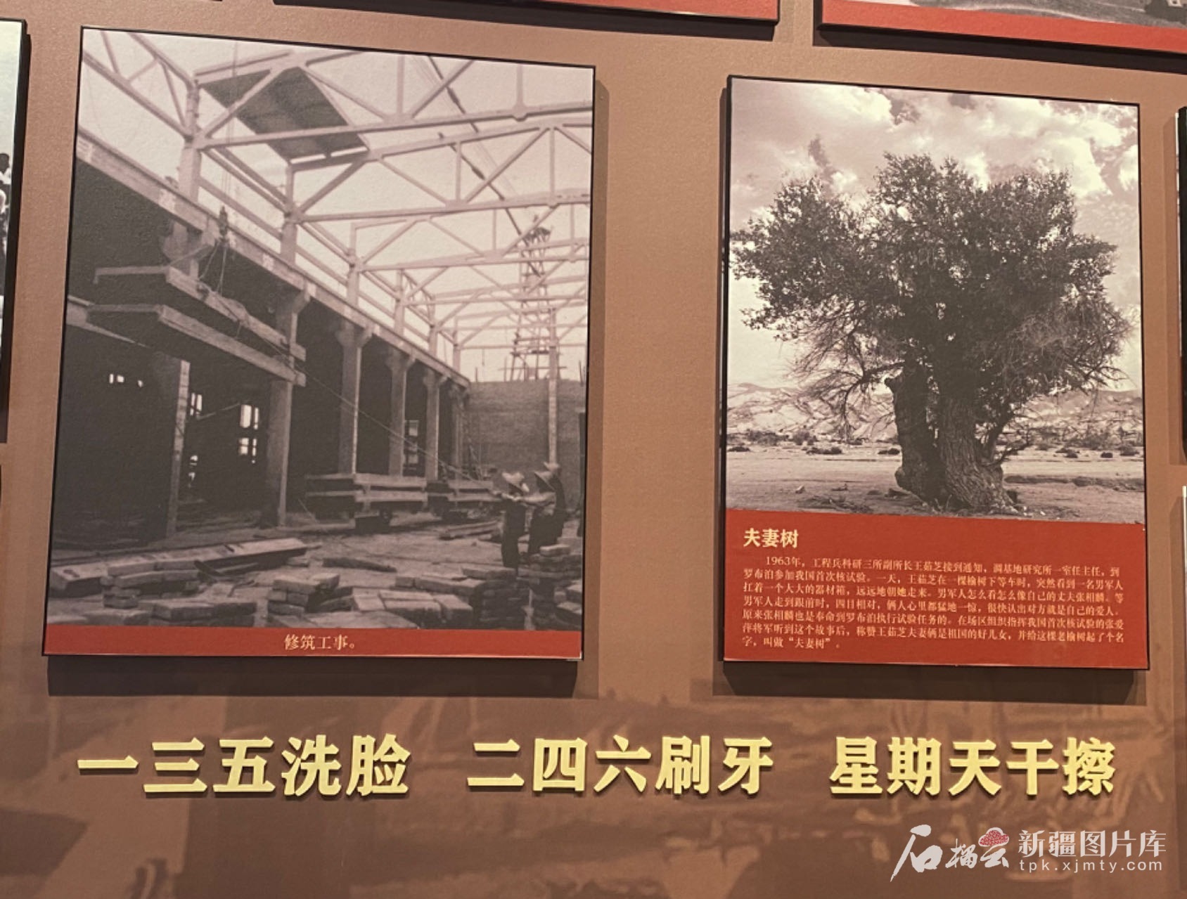 响应祖国召唤,无数科研工作者义无反顾地投身核试验事业。他们隐姓埋名,远离家人,把满腔热血倾注在这片荒凉的戈壁。一面贴满院士和将军照片的墙,以及大屏幕播放的“两弹一星”元勋珍贵黑白影像,再现了马兰人当年把青春、热血奉献给国防事业的历程。