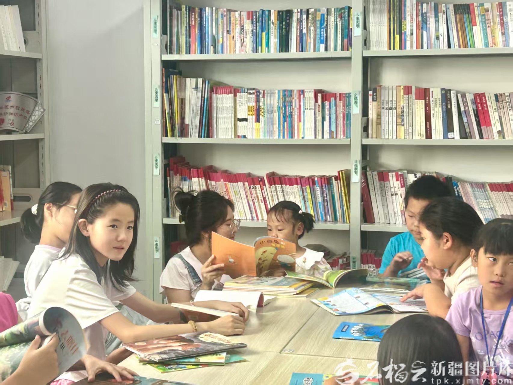 近日,在乌鲁木齐高新技术产业开发区(新市区)二工乡百园路新村工作的宣传干事王晓艳(左三)正在采访村里阅读室的孩子们。史冰佳摄