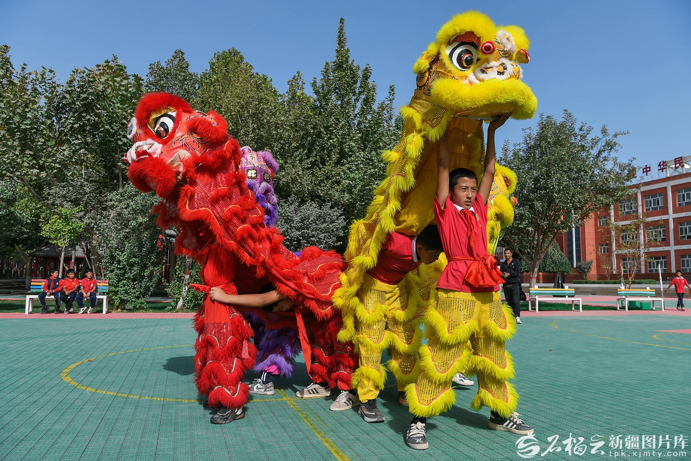 9月19日,疏附县托克扎克镇中心小学学生在表演舞狮。