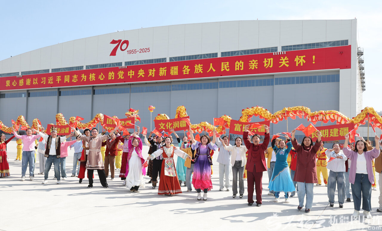 自治区各族群众代表身着节日盛装,挥动红旗和五彩花束,跳起欢快的民族舞蹈,欢迎总书记的到来,表达对总书记的衷心祝福。天山网-新疆日报记者 崔志坚摄