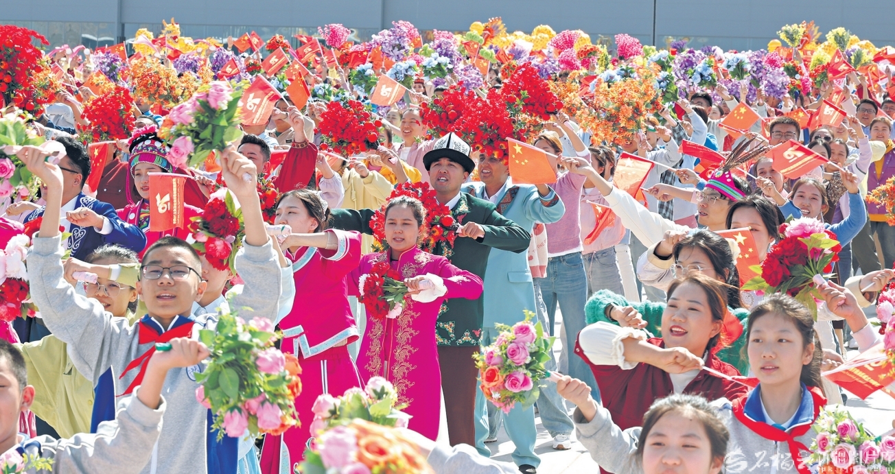 这是自治区各族群众代表挥动红旗和五彩花束,跳起欢快的舞蹈,热烈欢迎总书记的到来。天山网-新疆日报记者崔志坚摄