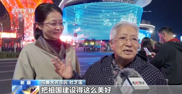 乌鲁木齐市民 杜芝莲:全国人民团结一心,把祖国建设得这么美好,真高兴,真骄傲,今天我的心情很激动,看到祖国的发展很高兴。