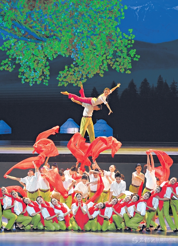 9月24日晚,庆祝新疆维吾尔自治区成立70周年文艺晚会《美丽新疆》在乌鲁木齐文化中心大剧院举行。图为节目《天山青松根连根》《燃情岁月》《我的爱献给祖国母亲》。天山网-新疆日报记者蔡增乐、汤永摄