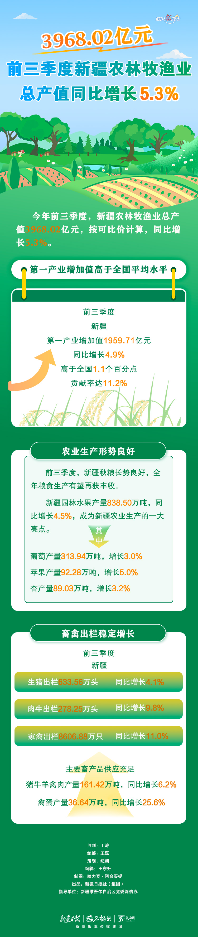 近期,新疆国民经济运行情况数据发布,前三季度,新疆农林牧渔业总产值3968.02亿元,按可比价计算,同比增长5.3%。农业生产形势如何?畜禽出栏情况怎样?今天的《数说“新”变化》一起来看看。