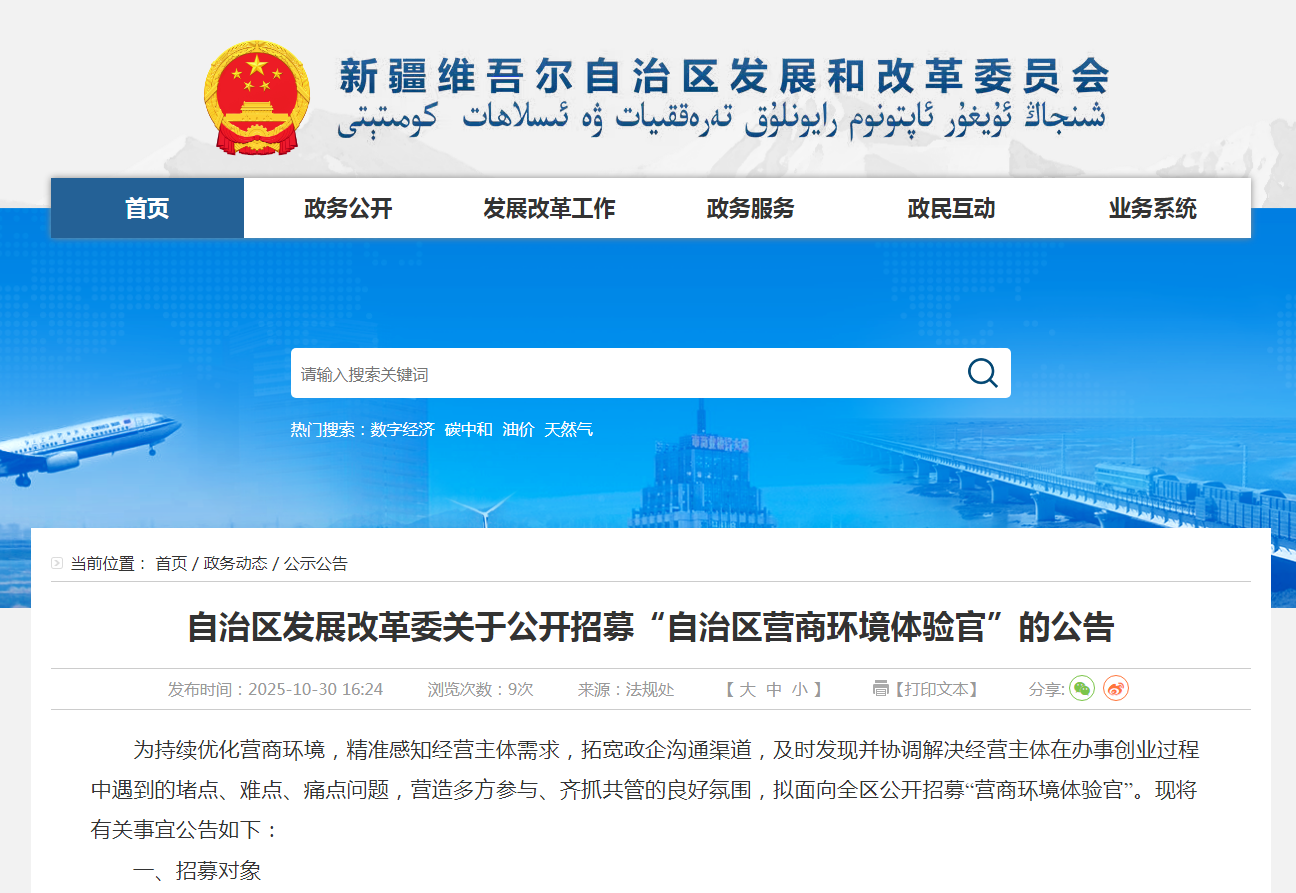 10月30日,自治区发展和改革委员会网站发布招募公告,面向社会公开招募100名“自治区营商环境体验官”。
