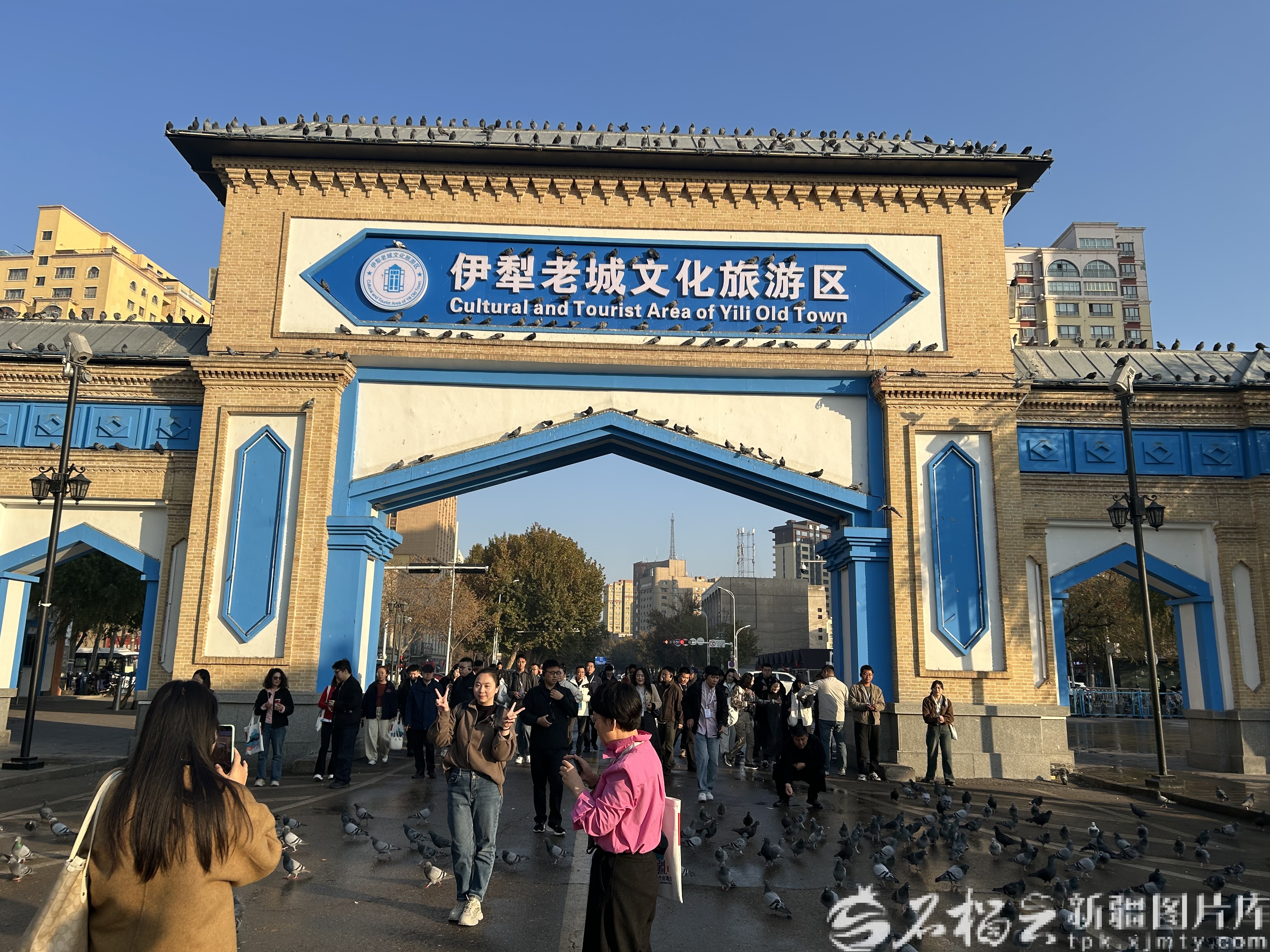 10月31日,秋日的阳光温柔地洒在伊犁老城文化旅游区的大门前,各地游客纷纷驻足,举起手机记录眼前的美好。湛蓝天空下,鸽群时而振翅掠过屋顶,时而停落在门前的石板路上,低头啄食游客递来的鸽粮。这些灵动的身影与游客脸上鲜活笑容,都成为大家手机里格外珍贵的镜头。