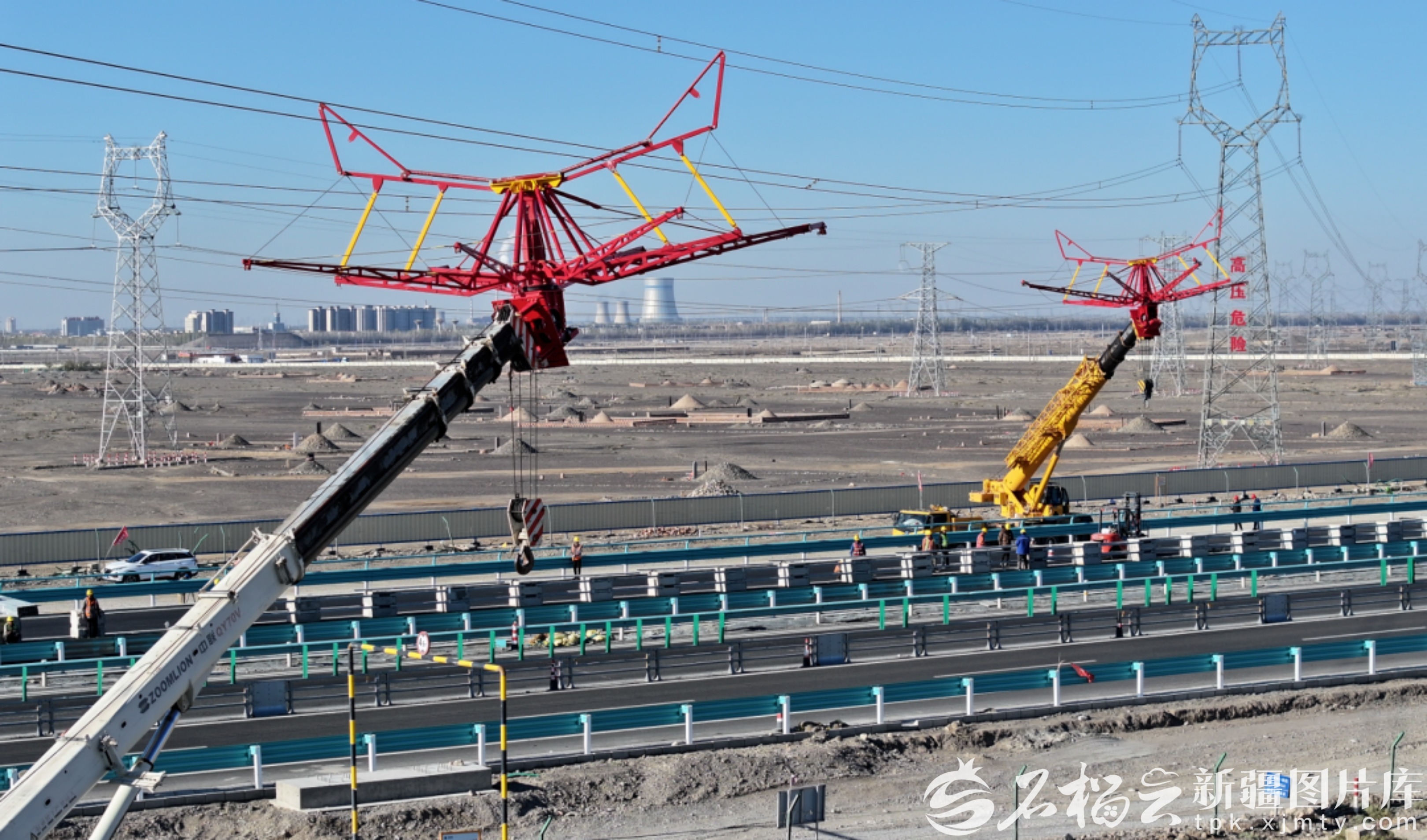 10月20日,G30连霍高速公路哈密段改造工程电力杆塔“移动式伞形跨越架”应用现场。郭子毅 摄