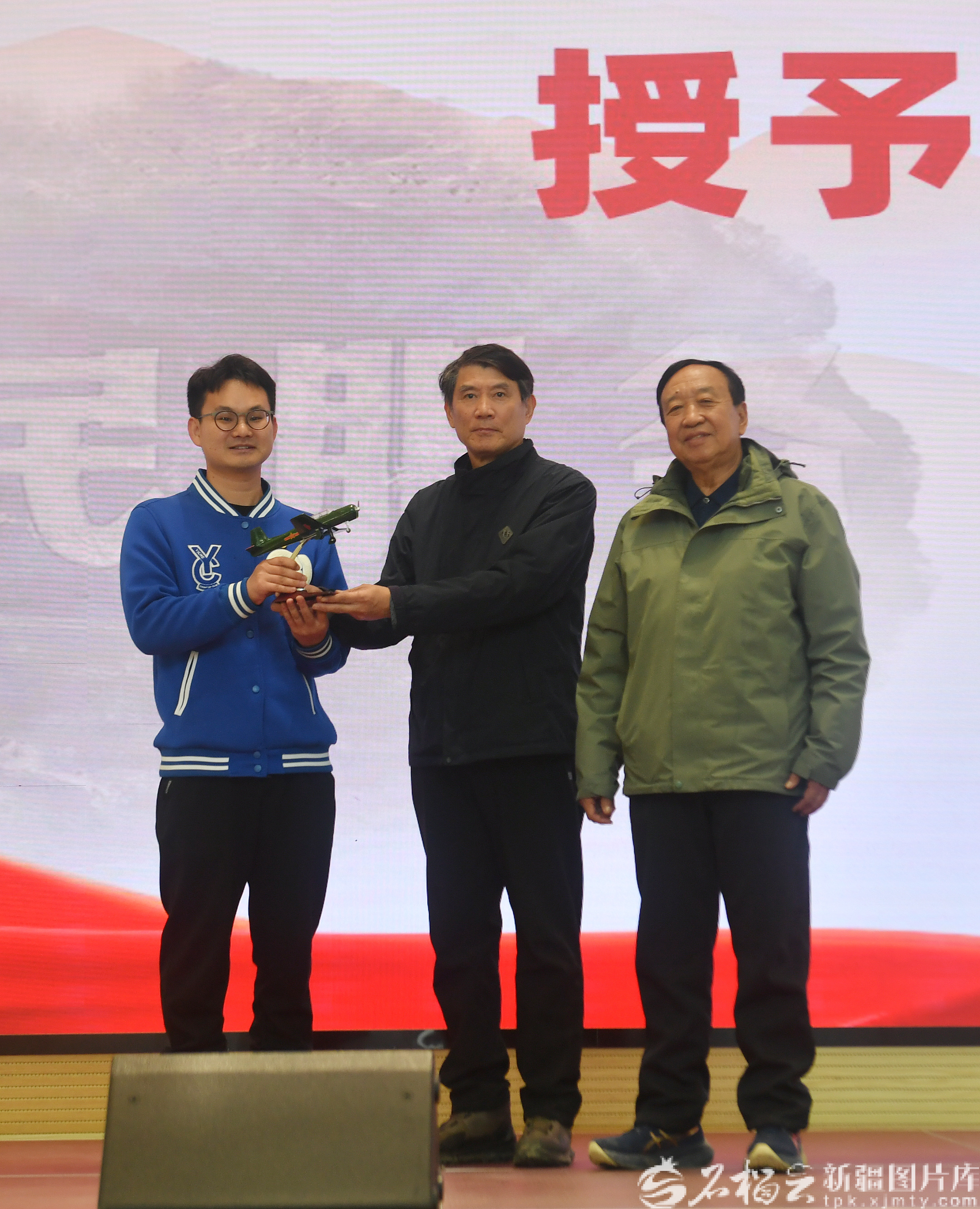 11月6日,空军老战士代表卢建华(右)、韩郑(中)向陆遥(左)赠送“初教六”飞机模型。天山网-新疆日报记者 邹懿摄