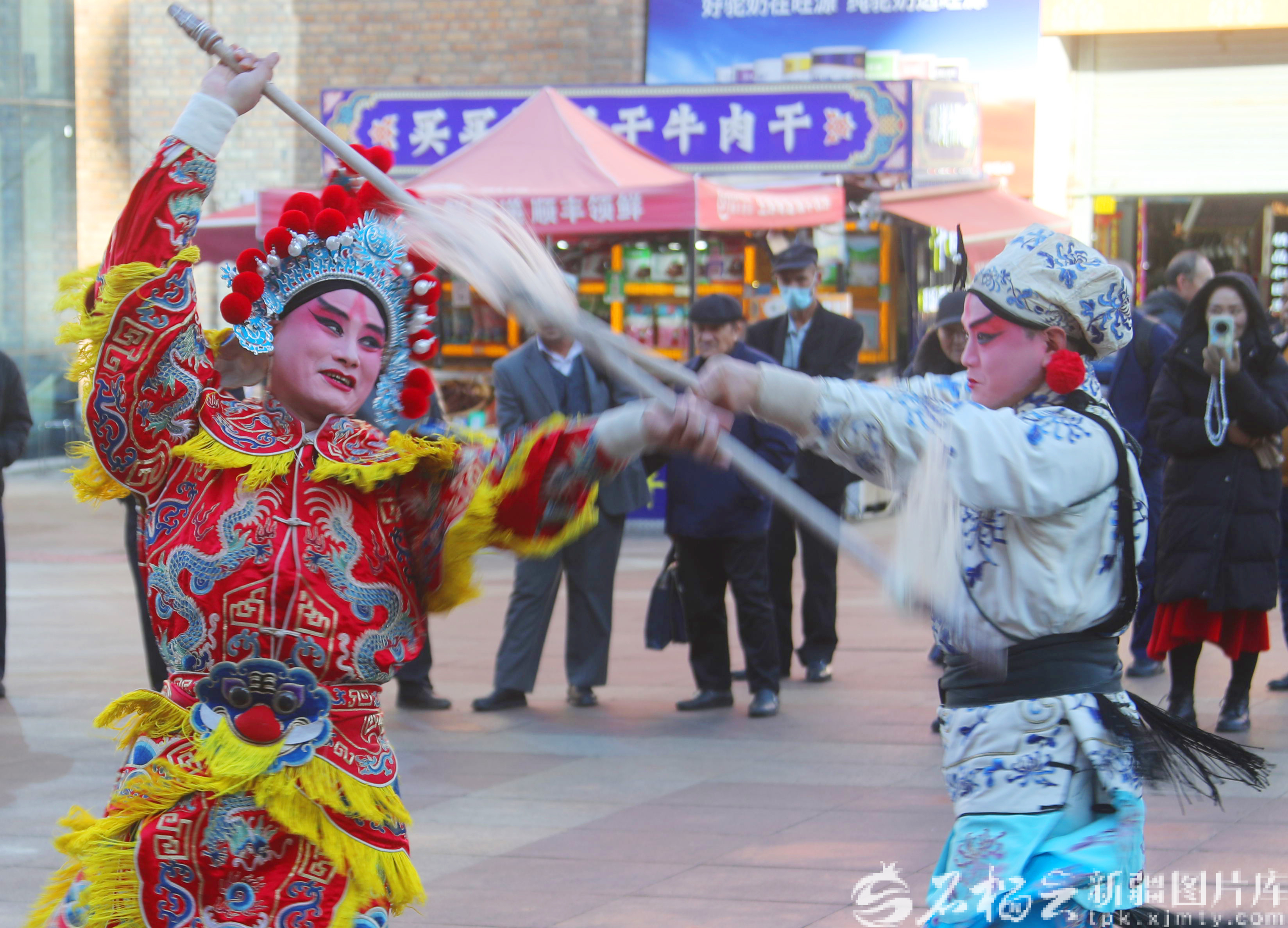 11月11日,在新疆国际大巴扎,豫剧表演者正在进行快闪表演。