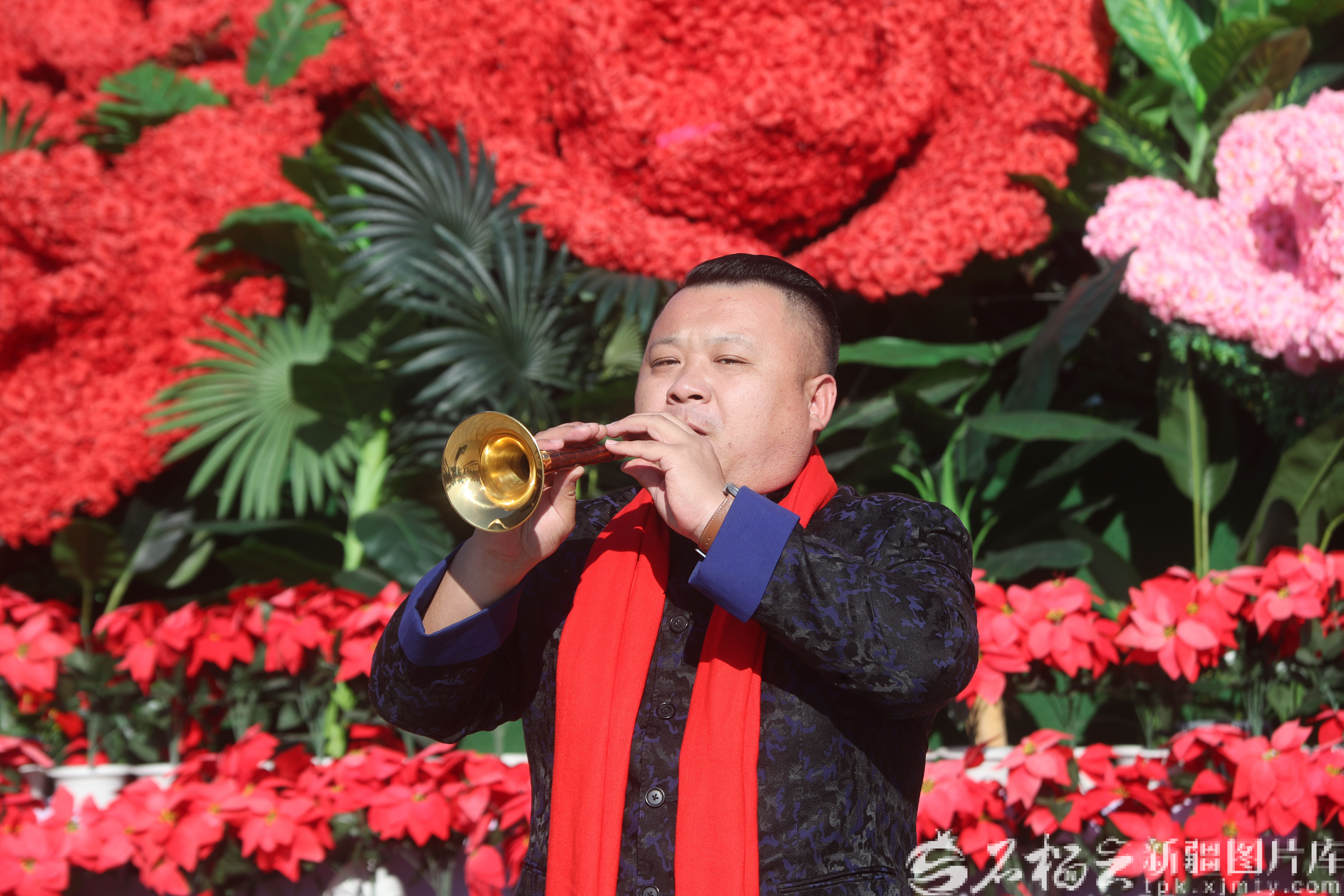 11月11日,在乌鲁木齐文化中心, 表演者正在进行吹唢呐表演。