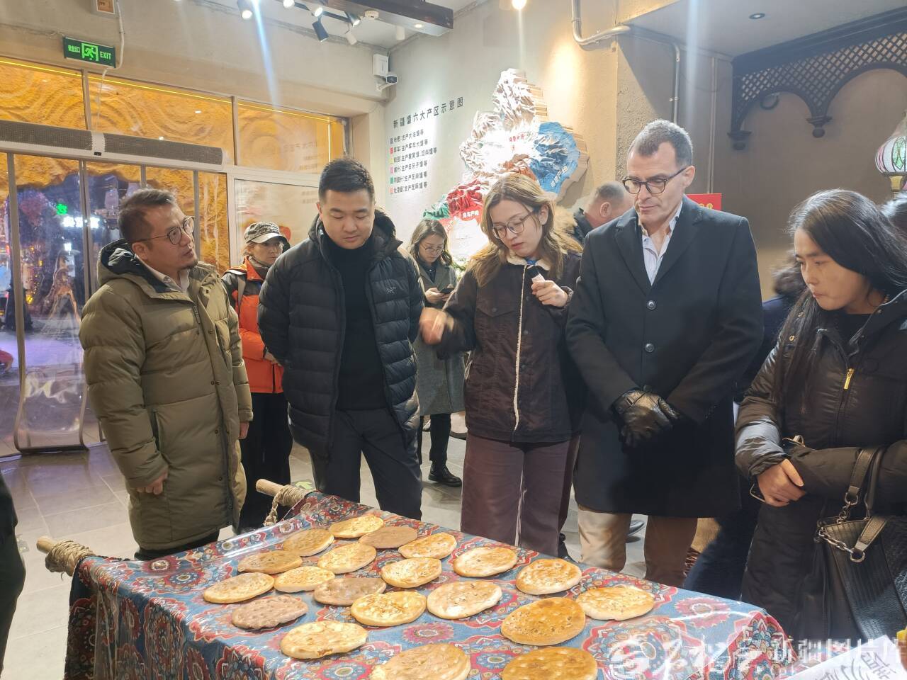 新疆国际大巴扎作为行程首站,以其特色建筑群、浓郁的民俗风情、丰富的文化产品和特色美食,深深吸引了卢睿朗一行。在馕主题馆内,种类繁多的各式馕品吸引了来宾的目光。卢睿朗表示:“这些馕保留了粮食的原始风味,体现了质朴之美,正如新疆人民纯朴善良的品格。我要多买一些,与亲友分享。”
