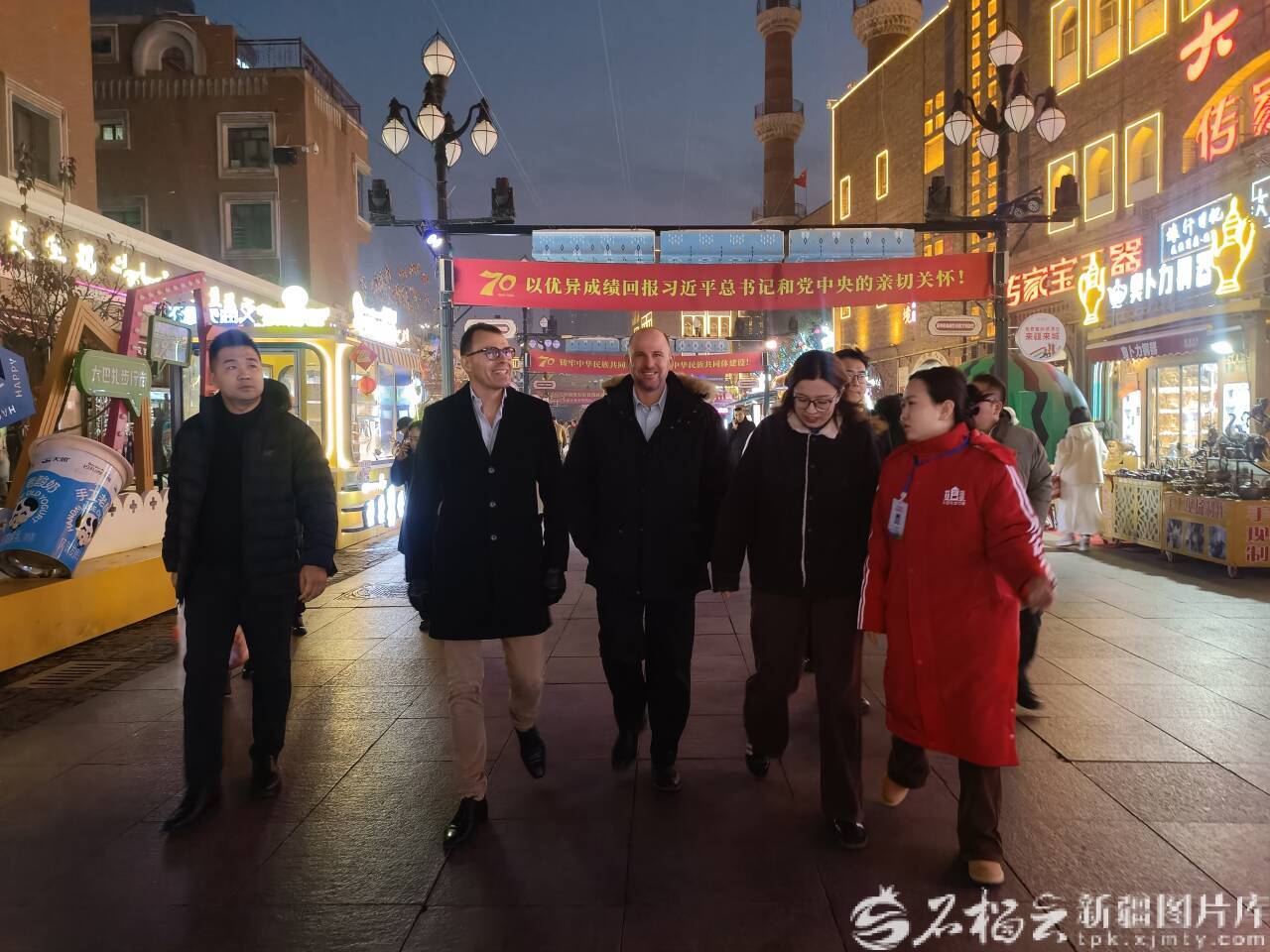 11月10日晚,在新疆国际大巴扎,卢森堡大公国驻华大使卢睿朗(左二)一行欣赏繁华的街景。天山网-新疆日报记者 于熙摄