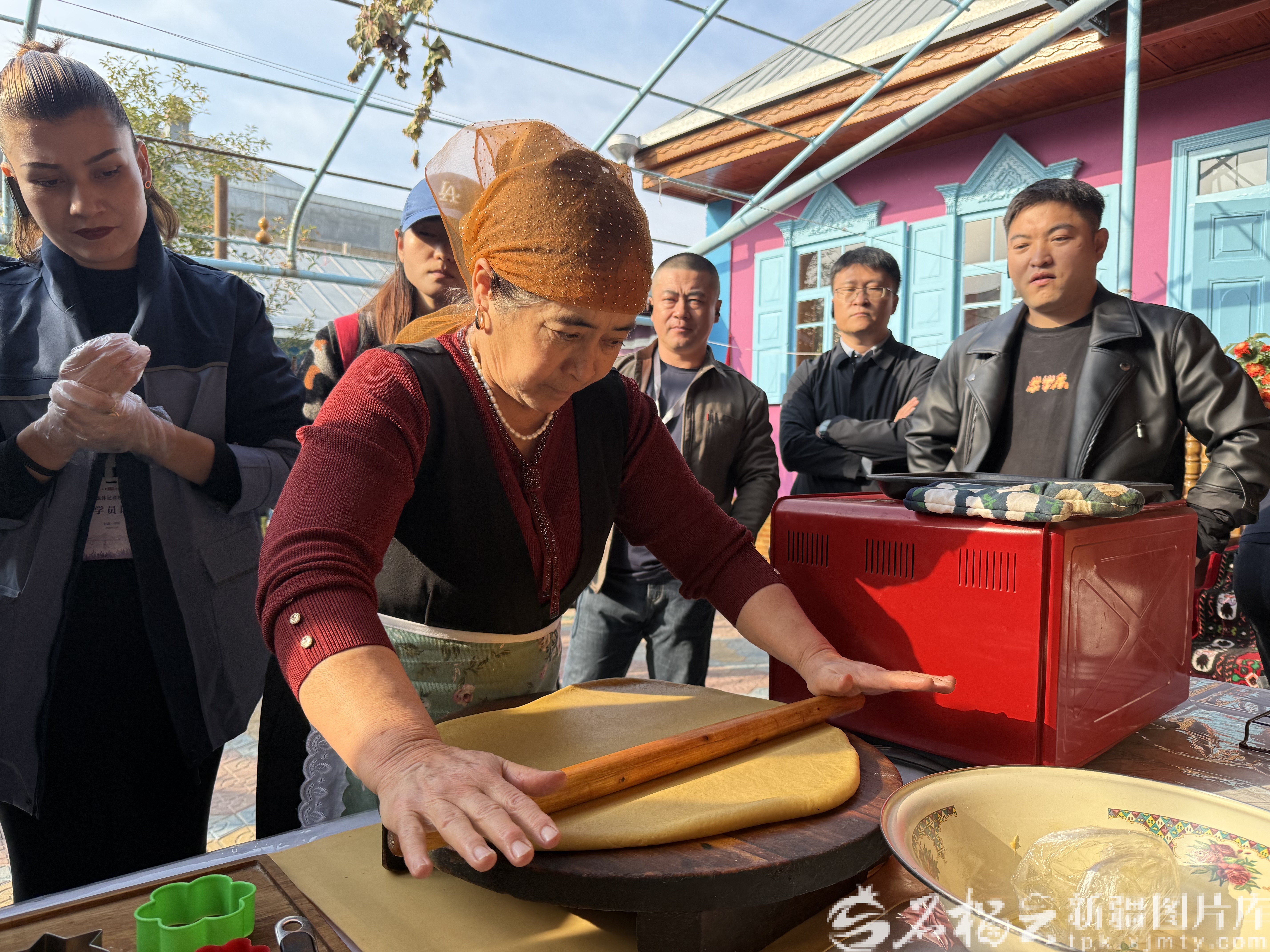游客们围拢过来,马依兰拿出模具,教大家做新疆点心。游客把沾了白糖的面胚粘在桌上,生涩的动作引来阵阵笑声。马依兰的手指一挑一拨,饼胚便服帖地躺进烤盘。动作流畅,17年的光阴,都融在这份手感里。